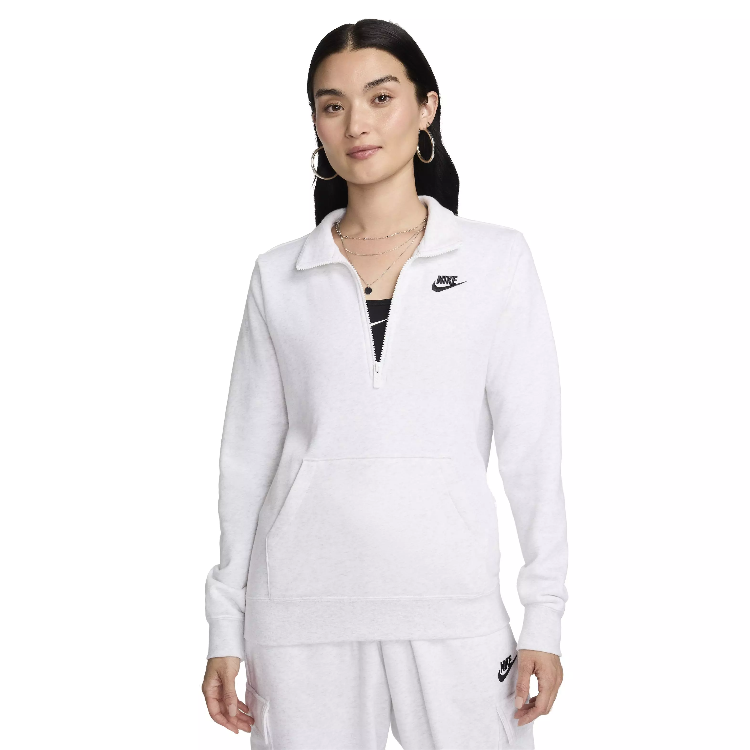 Slip into cozy, go-anywhere comfort with the Nike Women's Sportswear Club Fleece 1/2 Zip Sweatshirt. Its plush fleece and relaxed fit deliver easy layering, while the stand-up collar and half-zip let you adjust airflow and coverage to match the weather. Ribbed trims help seal in warmth without feeling tight.