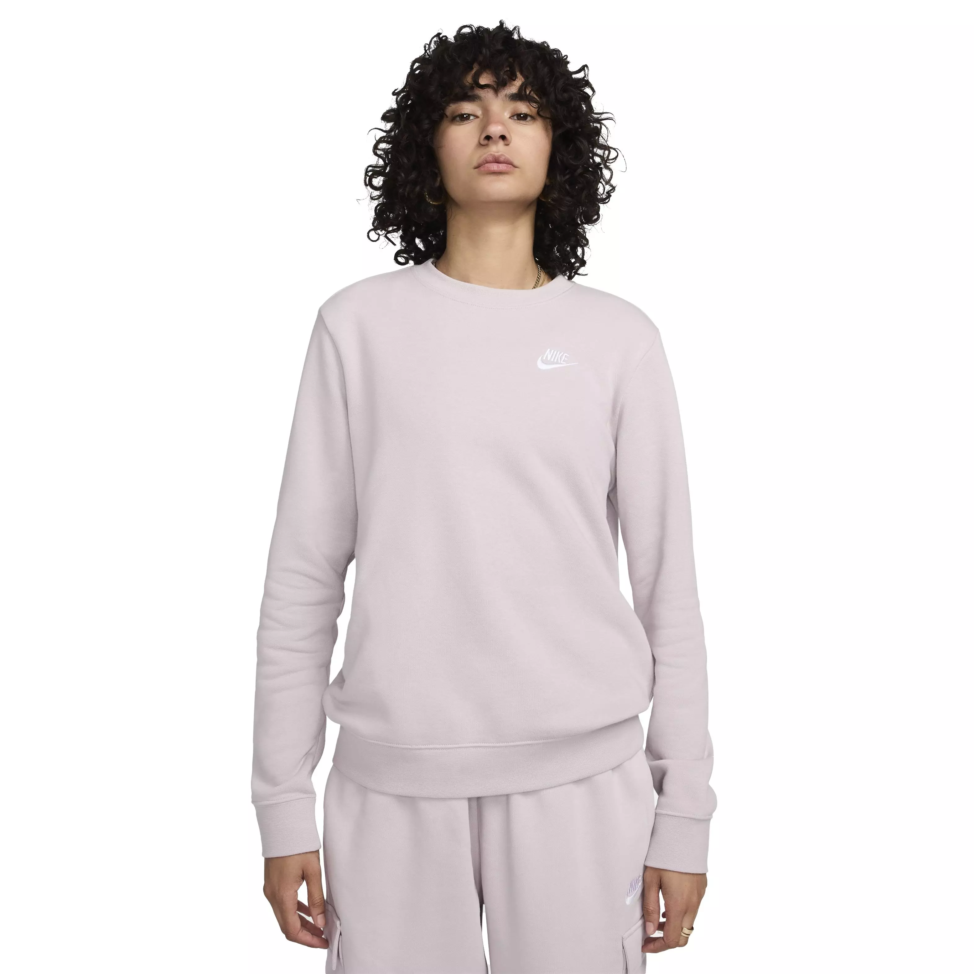 The Nike Women's Sportswear Club Fleece Crewneck Sweatshirt features plush fleece, a relaxed fit and cozy consistency. Soft interior traps warmth as you layer under jackets and puffers. Its simple design adds reliable warmth without bulk.