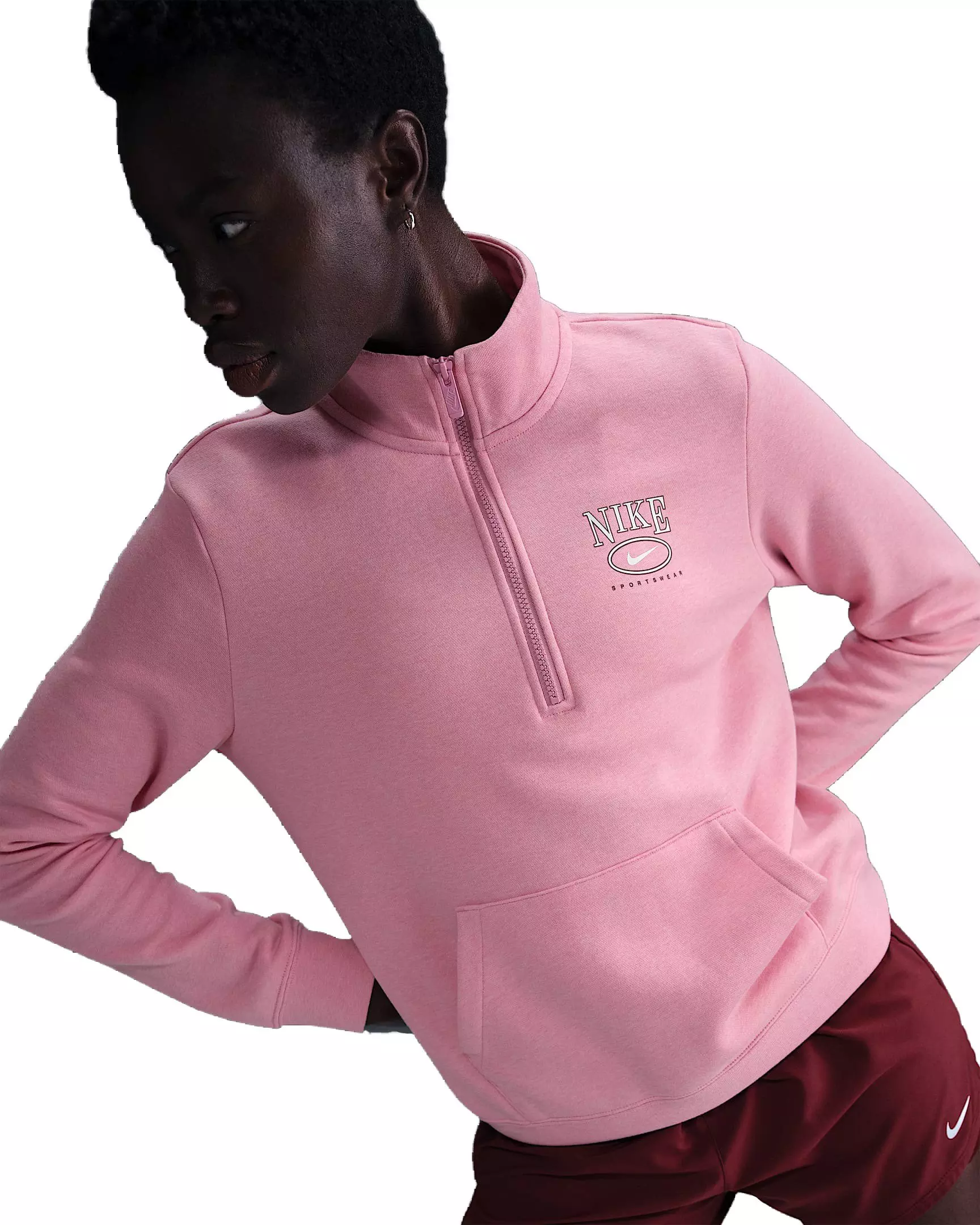Slip into easy warmth with the Nike Women’s Sportswear Club Fleece Mock-Neck 1/2 Zip Graphic Top in Pink. Smooth on the outside and softly brushed inside, its midweight fleece feels cozy without weighing you down. The mock-neck and half-zip let you adjust coverage and airflow as your day shifts.