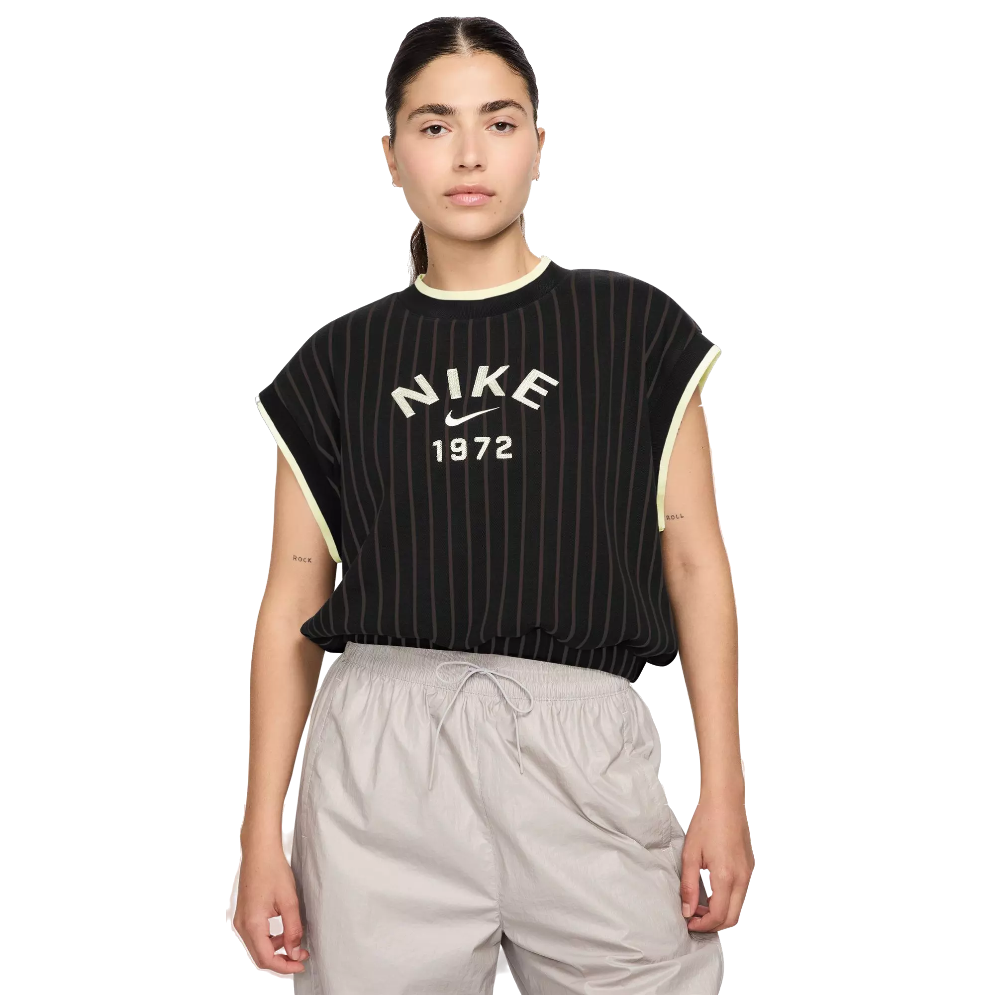 Drawing inspiration from heritage track styles, this Nike Women's Sportswear Collection Knit Tank Top has a laid-back look for everyday wear. Midweight cotton jacquard features subtle stripes while the ribbing at the collar and sleeves helps add dimension. Elastic at your waist creates a cinched silhouette, completing the sport-inspired design.