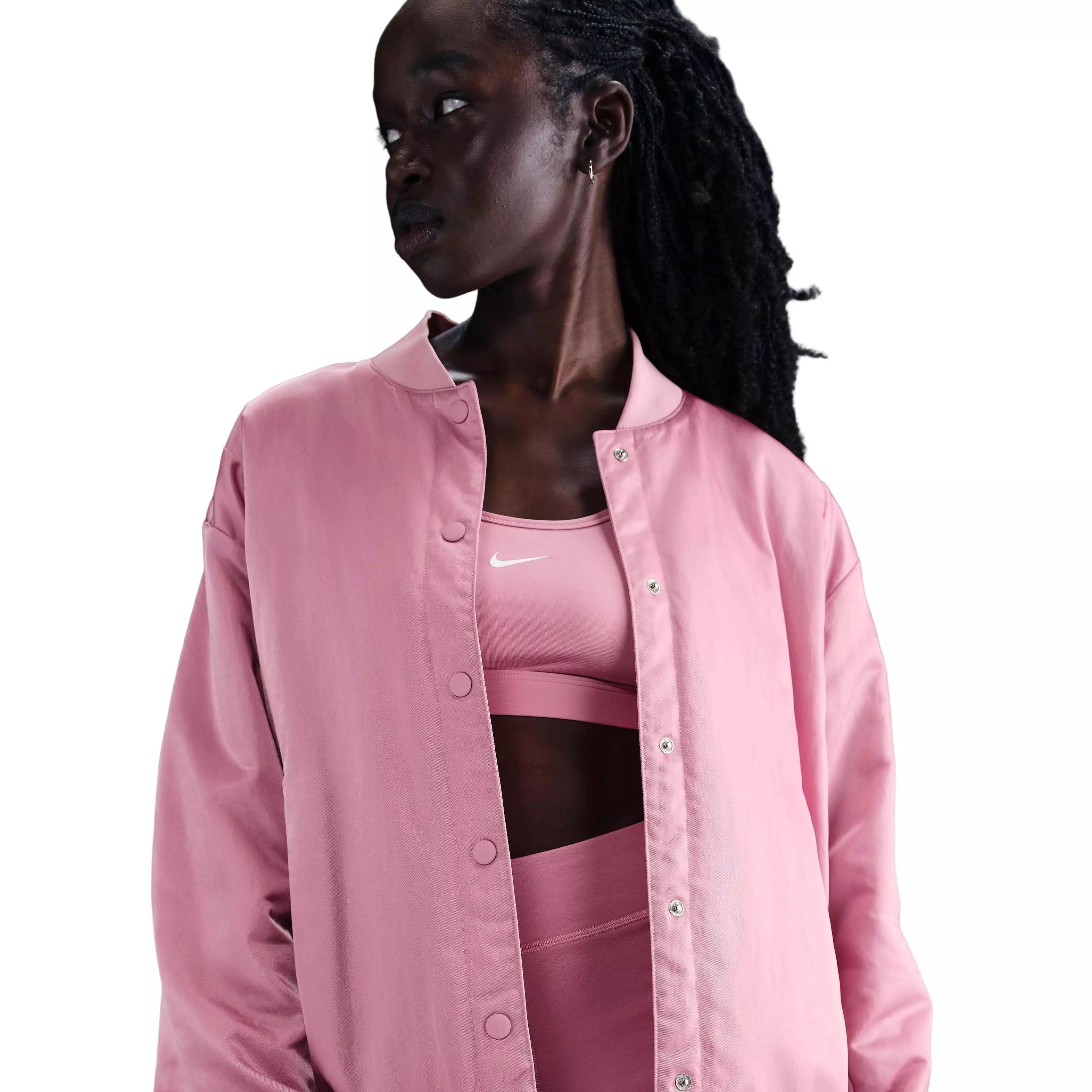 Layer up in this Nike Women's Sportswear Destroyer Oversized Woven Jacket - Pink. A light fill and oversized fit give you plenty of dimension while snap closures offer styling versatility.Features