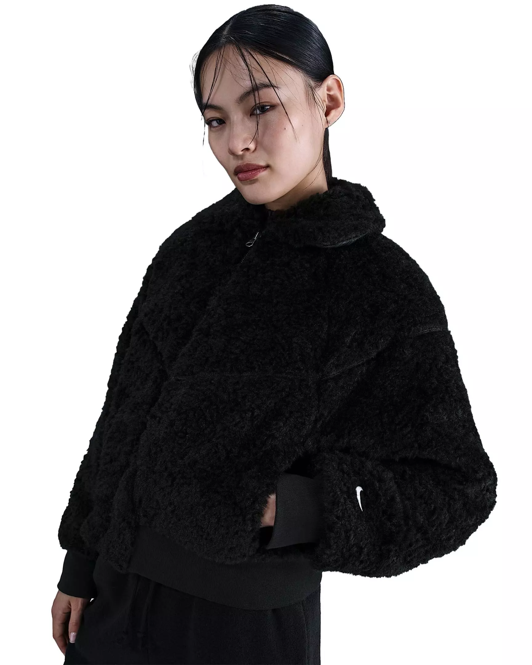 Designed for cozy warmth, this insulated sherpa Nike Women's Sportswear Essential Loose Bomber Jacket - Black pairs a classic bomber silhouette with a roomy fit, making it an easy layer to throw on when temps drop.Features