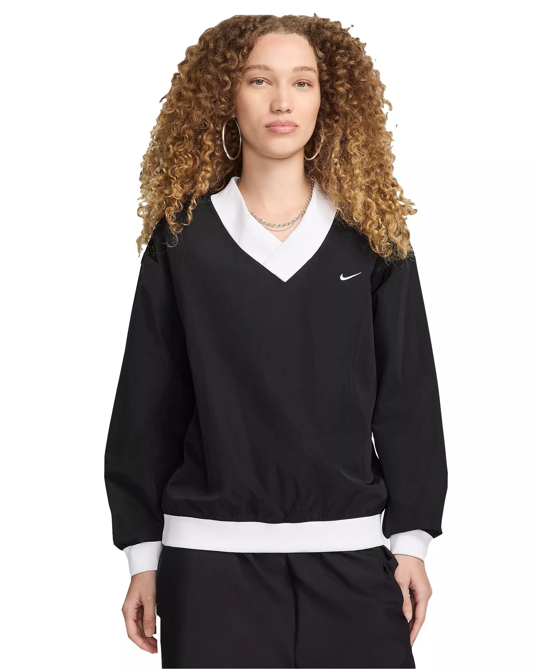 Engineered with a water-repellent finish and built-in UV protection, the Nike Women's Sportswear Essential Loose UV Woven Long Sleeve V-Neck Top shields against unexpected showers and sun exposure.