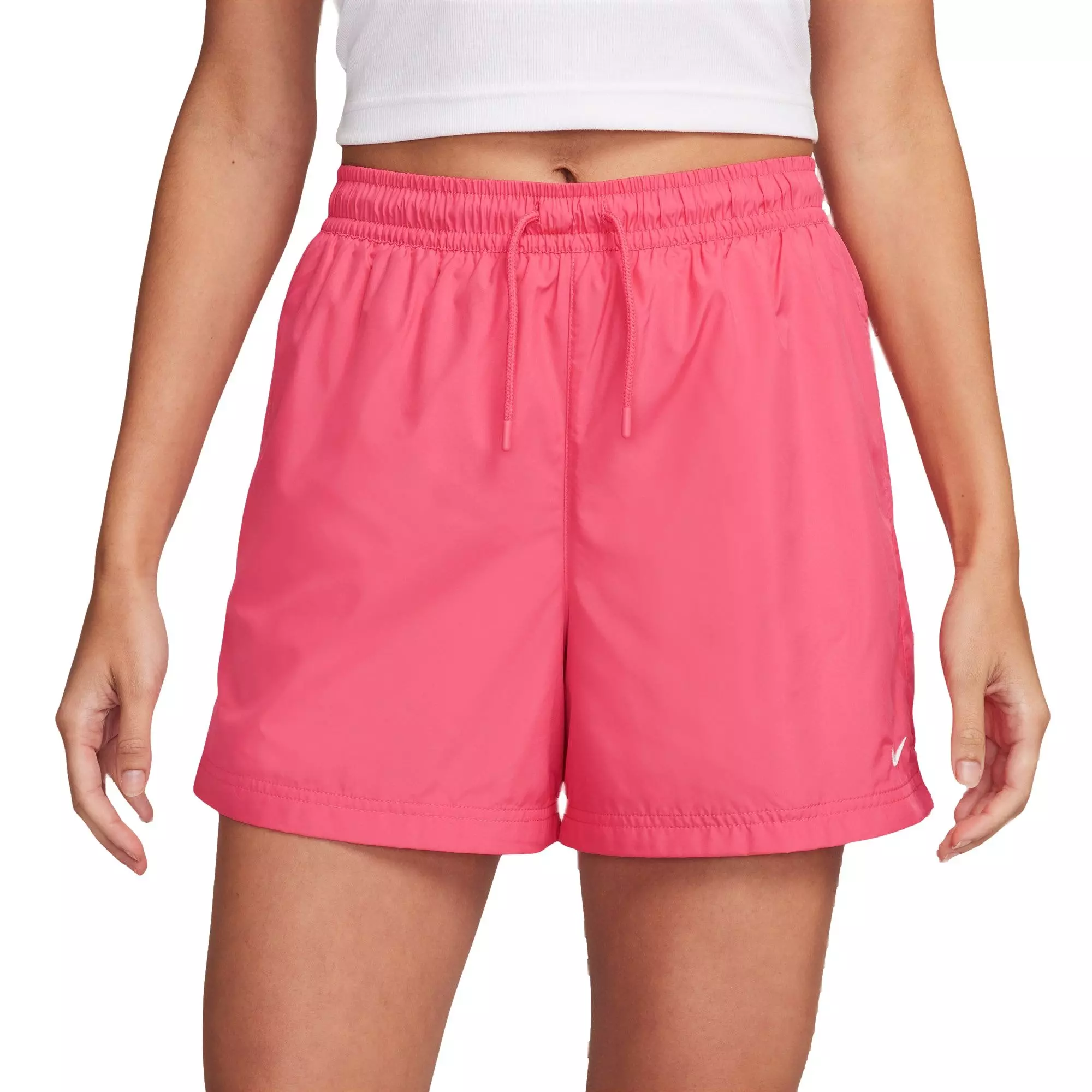 Designed with a classic sport look and lightweight construction, the Nike Women's Sportswear Essential Mid-Rise Woven Shorts-Pink handle any challenge. The mid-rise fit, elastic waistband and internal drawcord ensure a secure, comfortable hold throughout busy days.