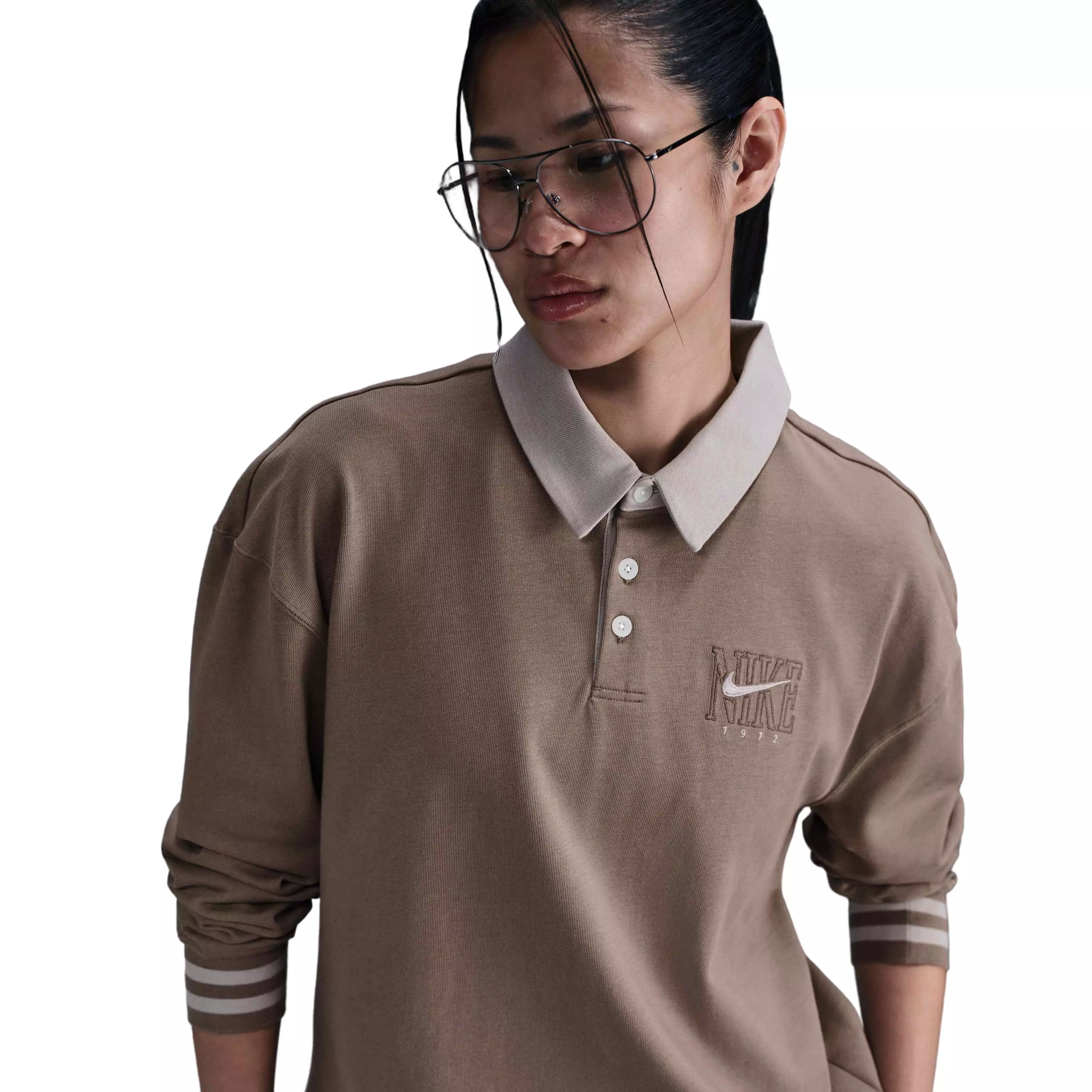 This Nike Women's Sportswear Essential Oversized Long-Sleeve Polo - Brown has a structured collar and midweight cotton fabric keep it classic. Its oversized fit adds a laid-back vibe.Features