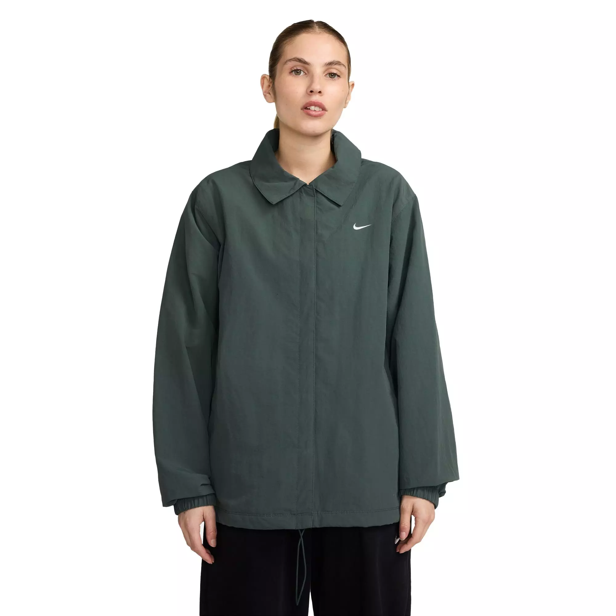 This lightweight Nike Women's Sportswear Essential UV Protection Woven Coach Jacket blends classic sport style with UV-shielding fabric that protects you from rain or shine. Dropped shoulders and an oversized fit let you wear it all day.