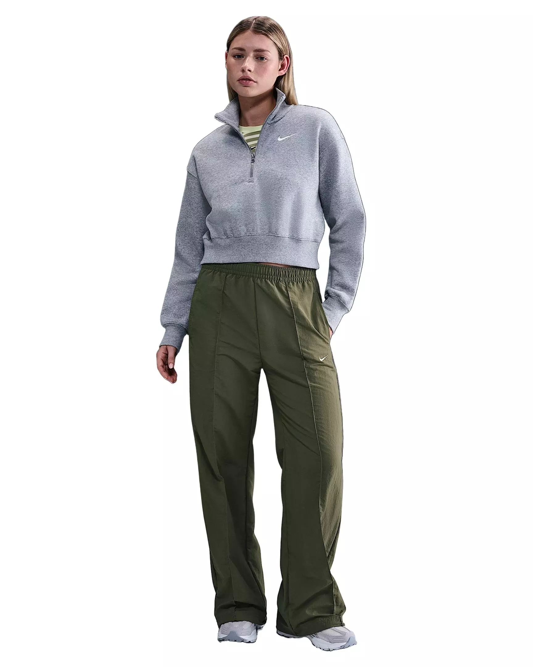 Simplicity meets functionality. These crisp, crinkled Nike Women's Sportswear Everything Wovens Mid-Rise Open-Hem Pants - Green have everything you need for all-day wear: water-repellent fabric, multiple pockets and an adjustable design. A bungee toggle at the hem means you can tighten it for a jogger-like fit or keep it open for a relaxed look. You've got stylish options—rain or shine.Features