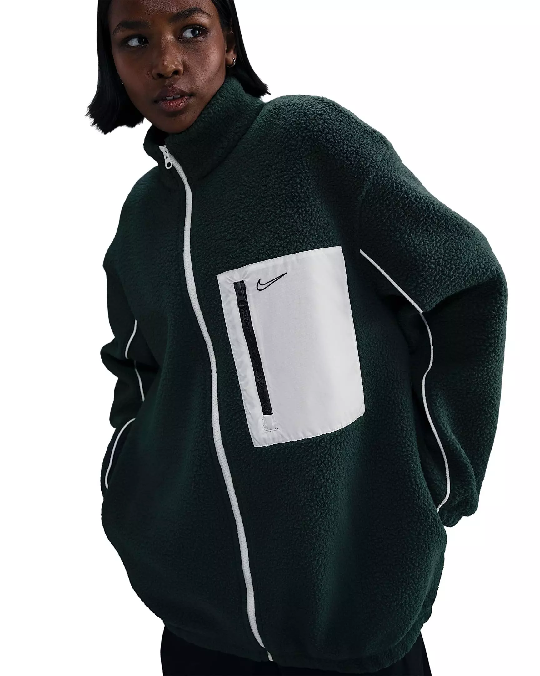Cozy up in this oversized Nike Women's Sportswear Full-Zip High-Pile Fleece Jacket - Green/White. Lofted fleece helps manage your body's natural heat to help keep you warm in cold conditions—and it feels super soft.Features