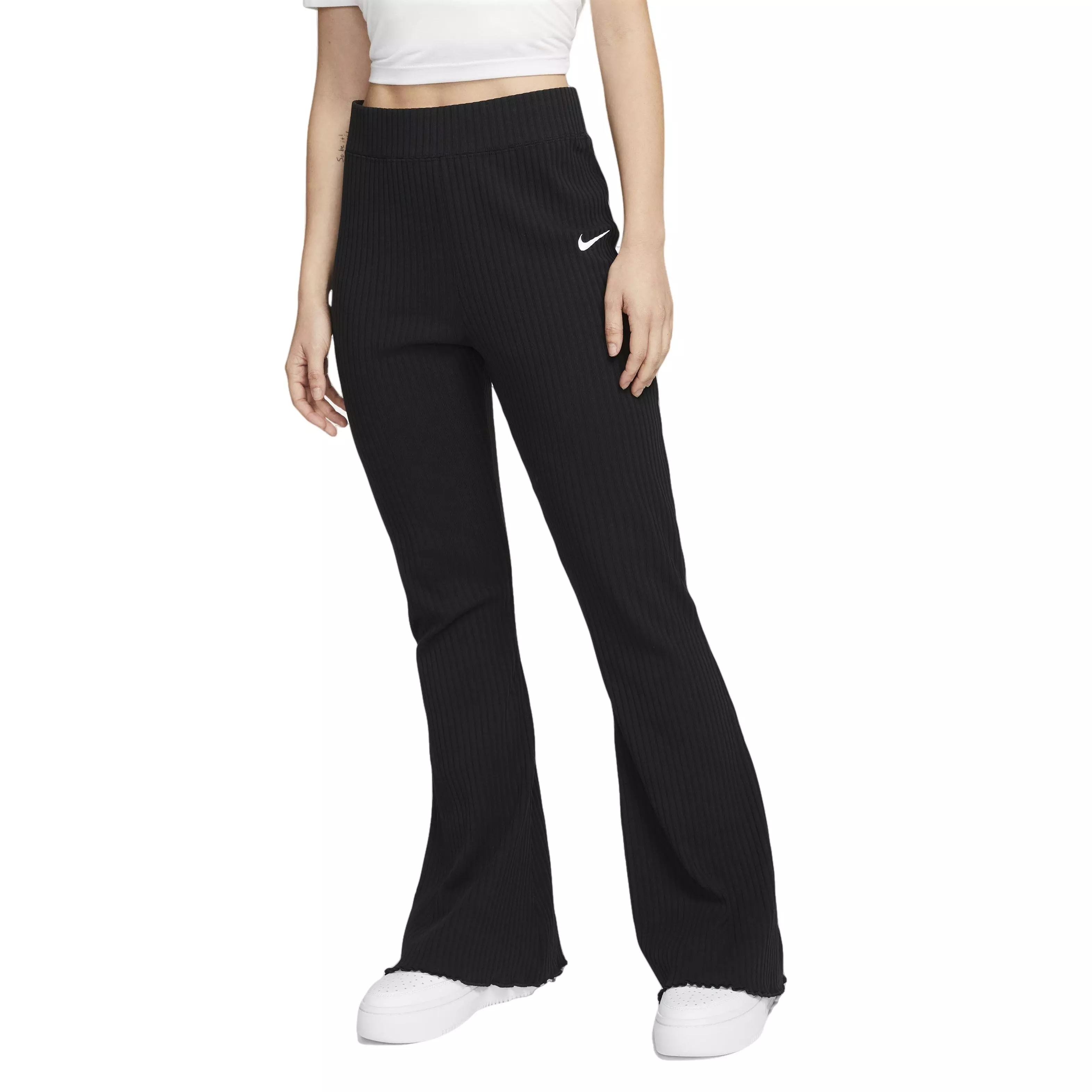 Keep it effortless and carefree in these snug knit Nike Women's Sportswear High-Waisted Ribbed Jersey Pants. Their ribbed fabric is lighter than fleece but still feels extraordinarily soft and comfy. The flare at the lower leg creates a throwback look and puts the spotlight on your shoes.Features