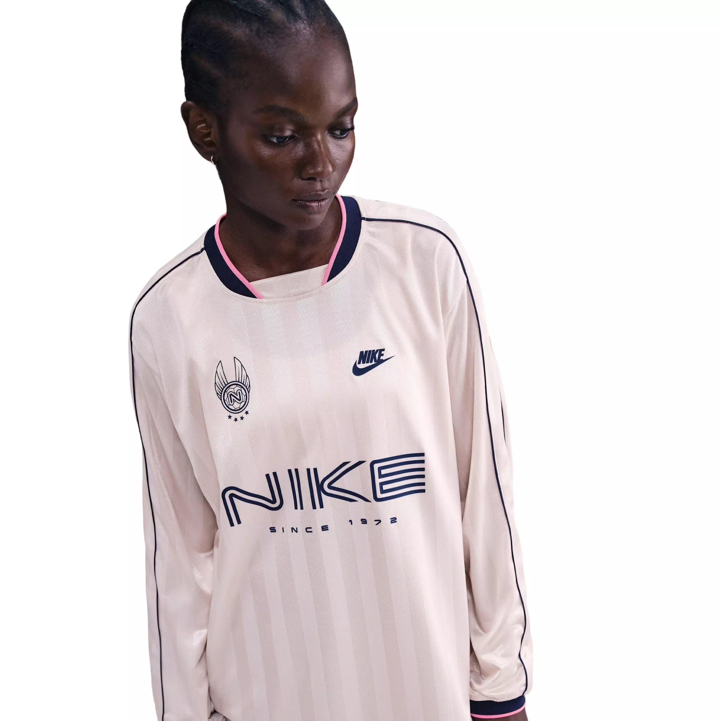 A sports jersey for your every day. This midweight jacquard lt pink Nike Women's Sportswear Long-Sleeve Jersey Top alternates matte and shine finishes for subtle dimension and an elevated drape.Features