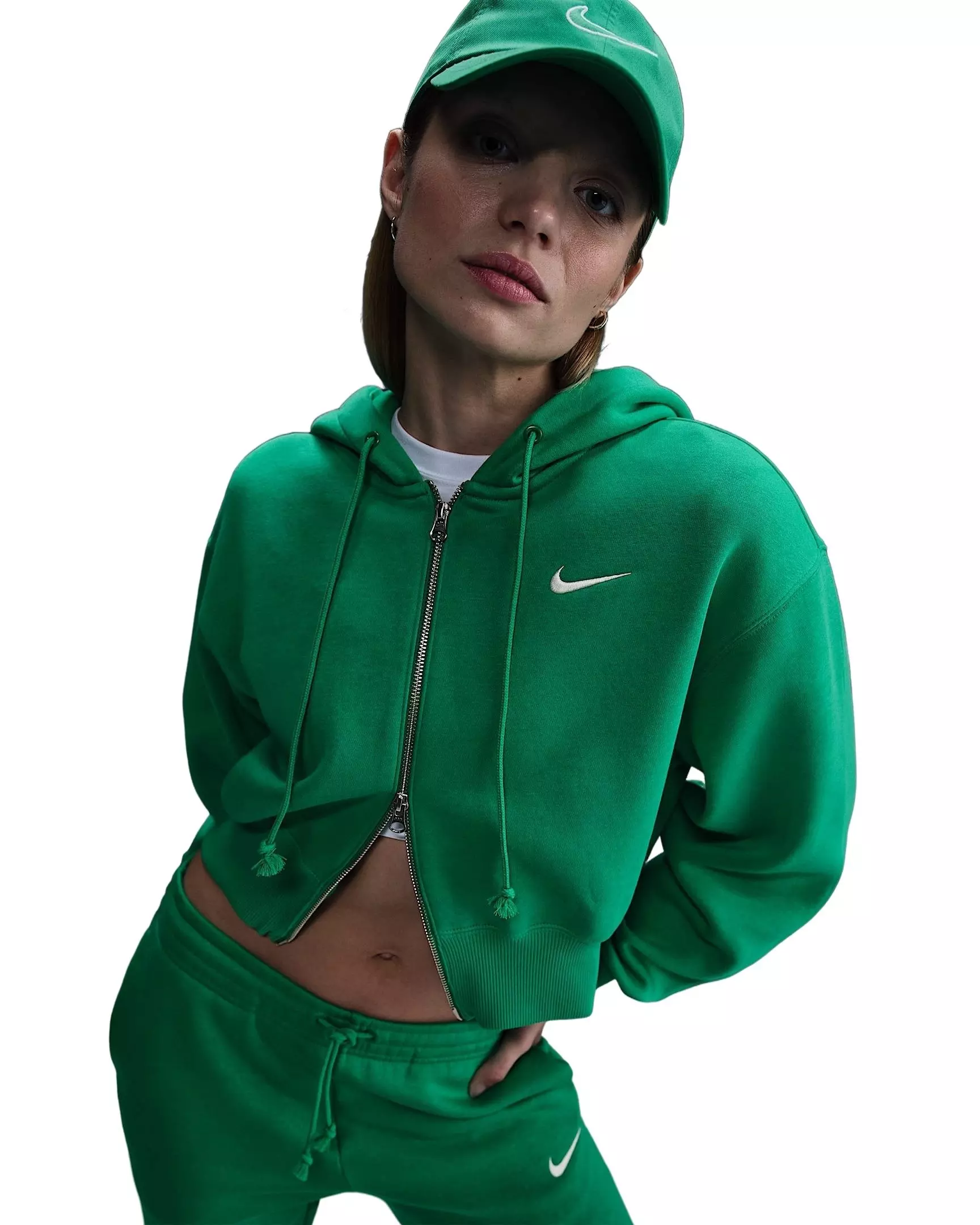 With a two-way zipper and a loose fit that's perfect for layering, this cozy Nike Women's Sportswear Phoenix Fleece Loose Cropped Full-Zip Hooded Jacket - Green gives you plenty of styling options.Features