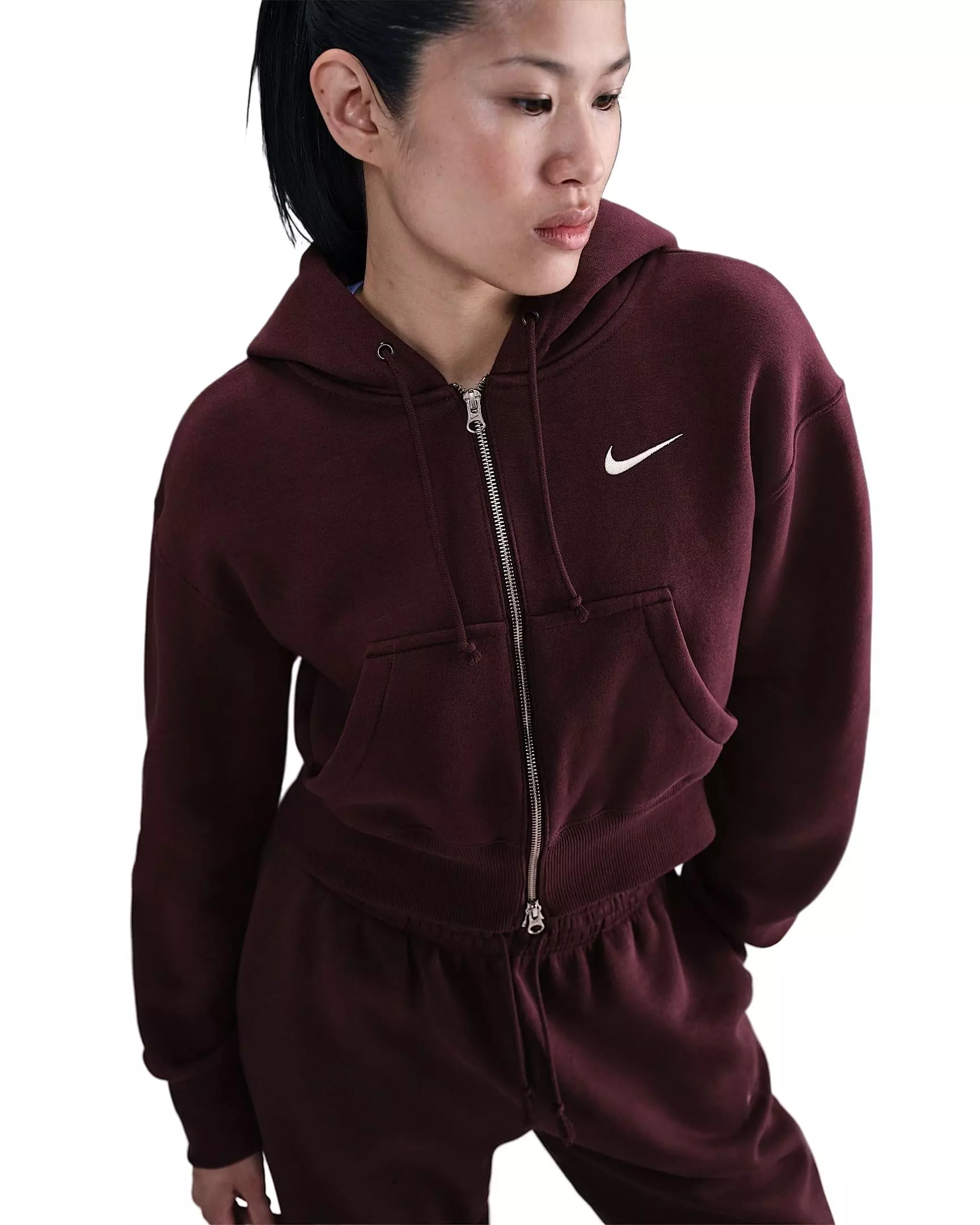 With a loose fit and extra-soft fleece, this burgundy Nike Women's Sportswear Phoenix Fleece Loose Full-Zip Cropped Jacket has an all-day cozy feel. The two-way zipper gives you styling options.Features