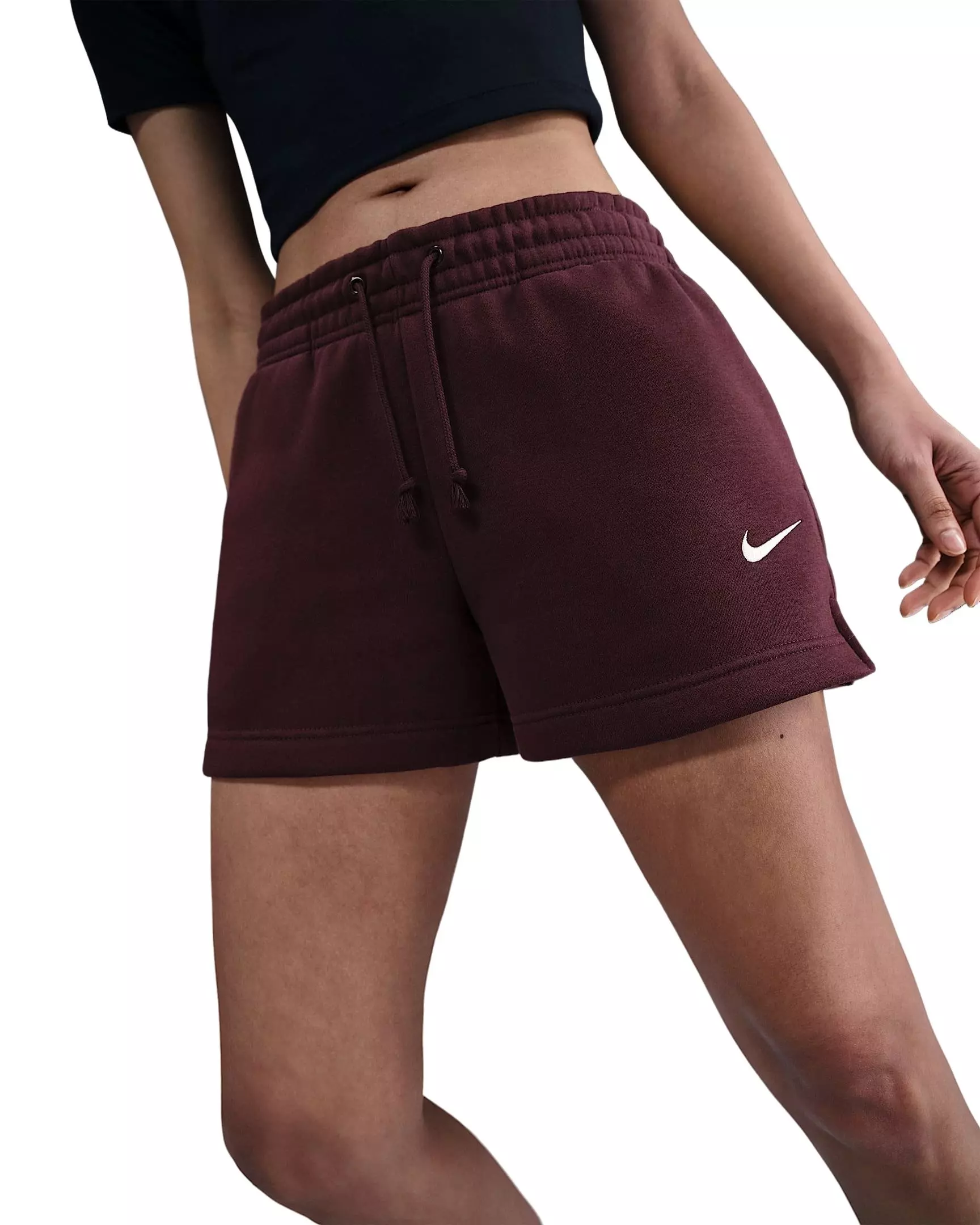 The Nike Women's Sportswear Phoenix Fleece Mid-Rise 4" Shorts -Burgundy wrap you in effortless comfort. Softly brushed on the inside and smooth on the outside, they deliver a cozy feel with a clean look that pairs easily with tees, hoodies, and sneakers.