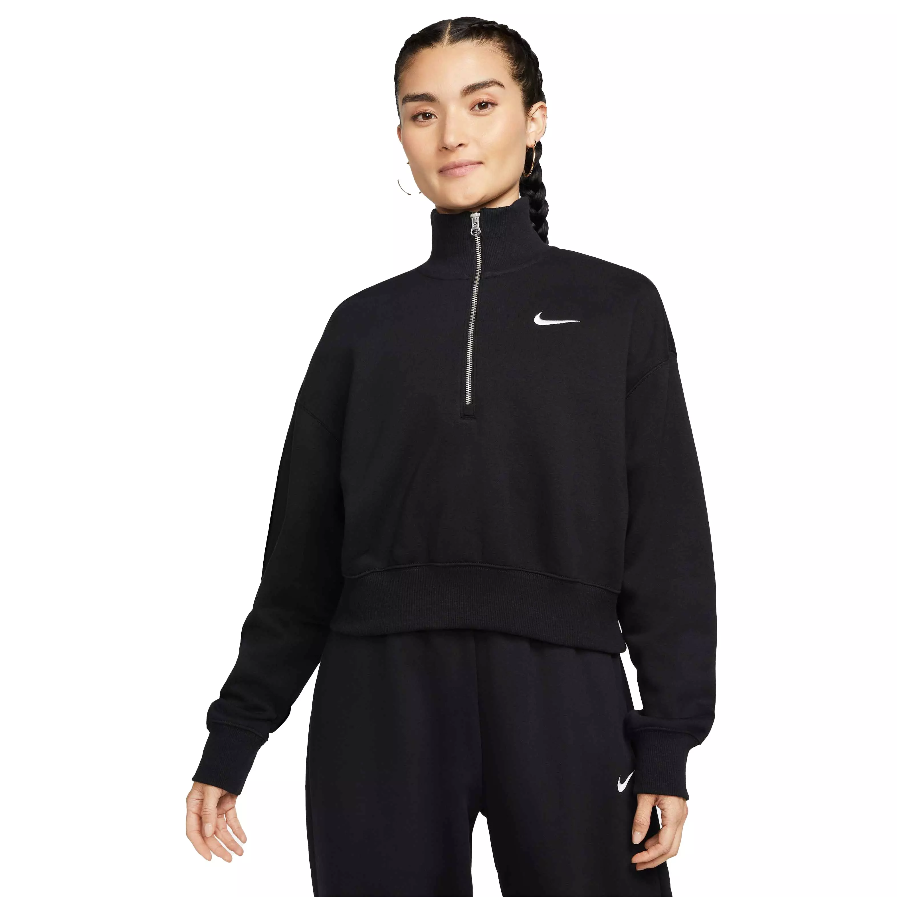 Rise up and transform your fleece wardrobe with strong cozy vibes. The Nike Women's Sportswear Phoenix Fleece Oversized 1/4-Zip Crop Sweatshirt uses a cropped cut to deliver a trend-right look and an oversized silhouette that creates relaxed styling.Taller ribbing at the hem, cuffs and collar adds bold definition and helps you stand out while keeping you cozy. Half-zip closure lets you adjust warmth and style with ease.