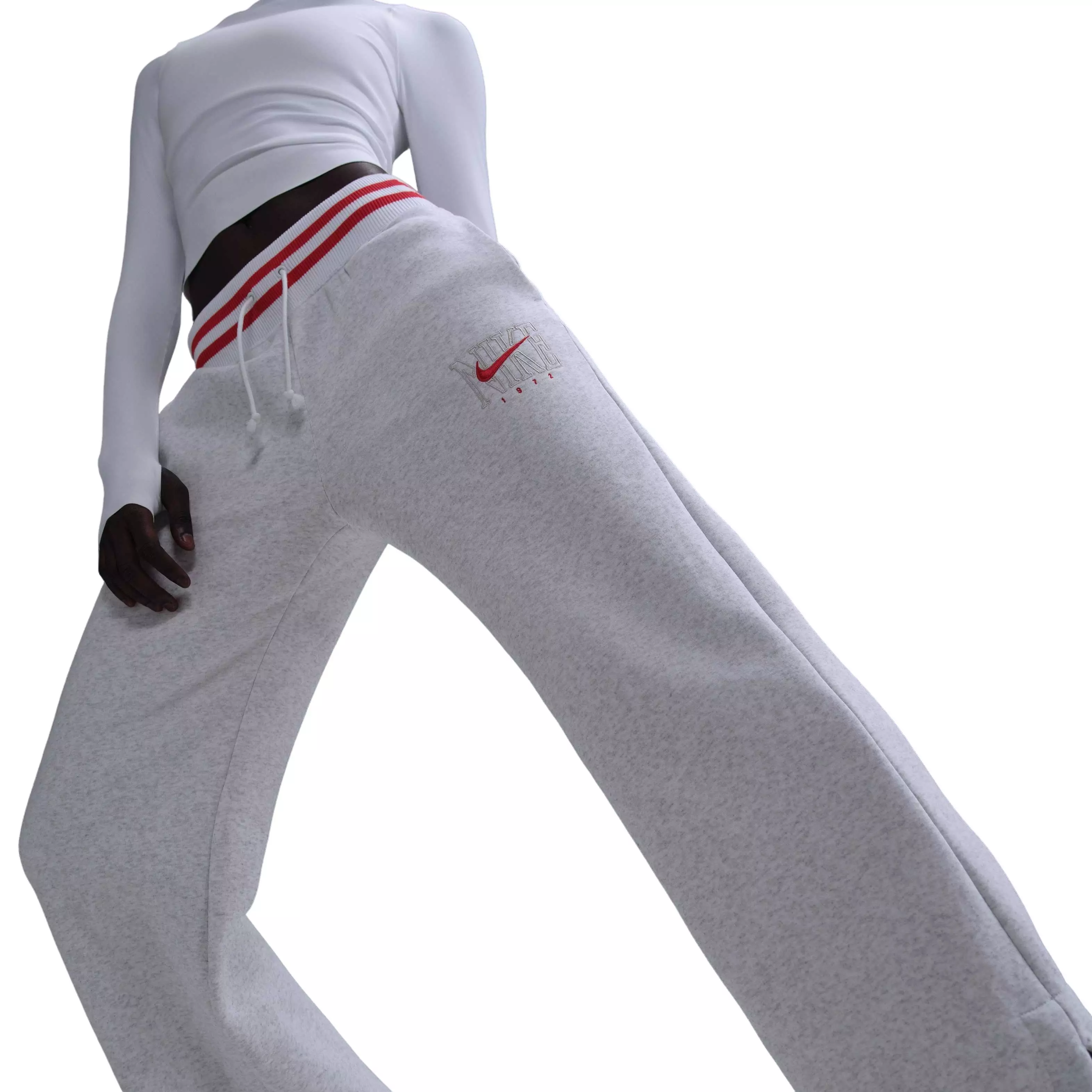 Past meets present in these birch heather Nike Women's Sportswear Phoenix Fleece Oversized Crewneck Sweat Pants-Birch Heather featuring an important year in Nike's history and a wide-leg design. Their midweight fleece feels extra soft on the inside and smooth on the outside for coziness and structure.Features