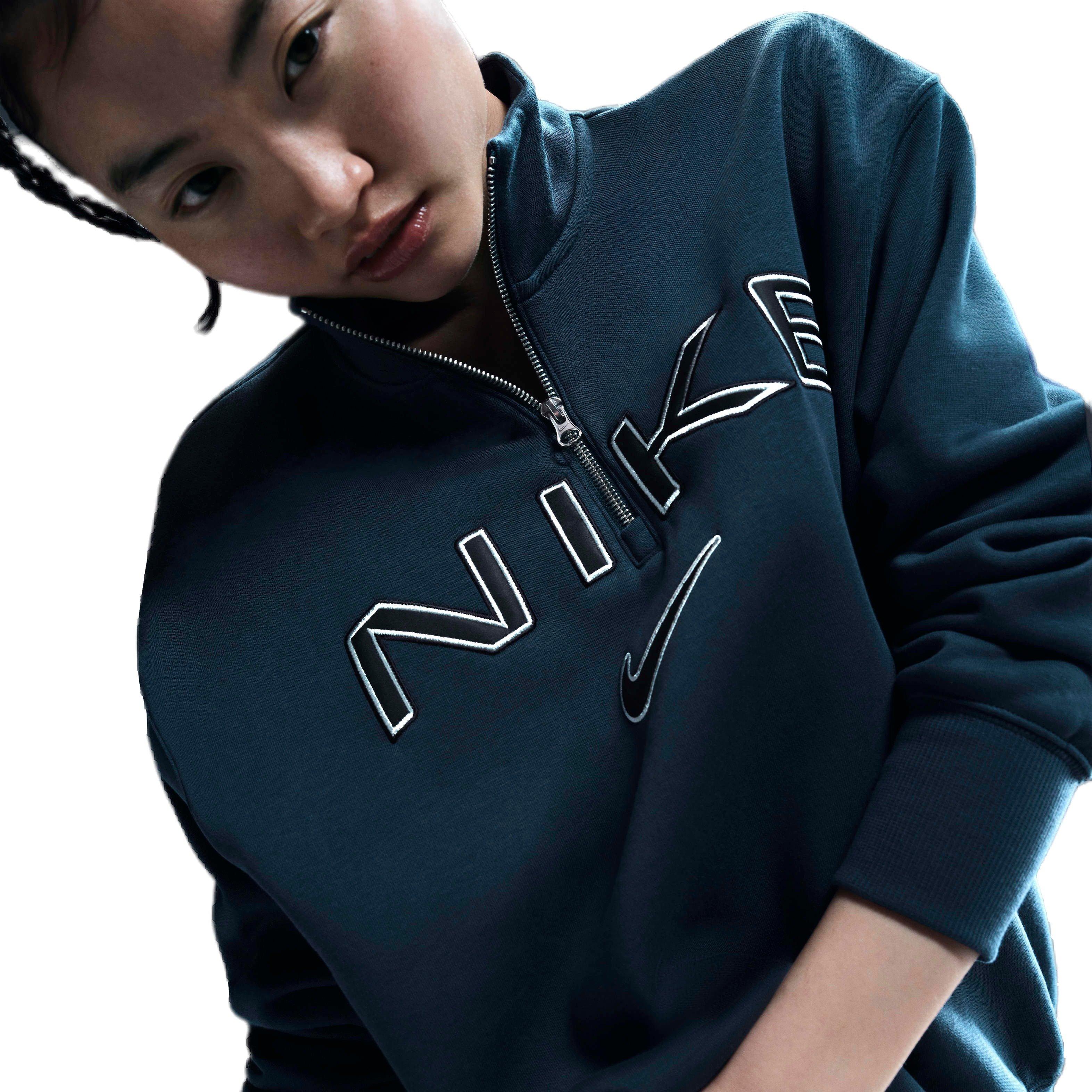 Grounded in style, comfort and versatility, meet our take on luxury loungewear. This voluminous Nike Women's Sportswear Poenix Fleece Oversized 1/4-Zip Logo Top merges the best of both comfort and structure by combining our cozy, midweight brushed fleece with sturdy ribbed trims. The dropped shoulders and extra length add to that laid-back look, helping you chill in style.Features