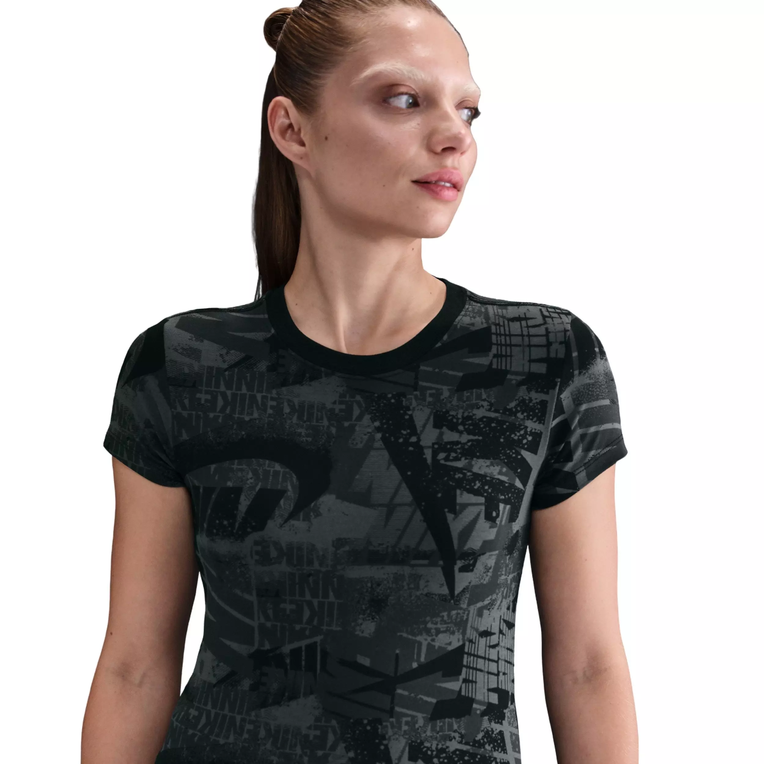 An everyday essential, this slim-fitting black Nike Women's Sportswear Short-Sleeve Street AOP T-Shirt is classic and versatile. Our smooth jersey feels stretchy with a slight drape, giving it a comfortable, body-skimming feel.Features