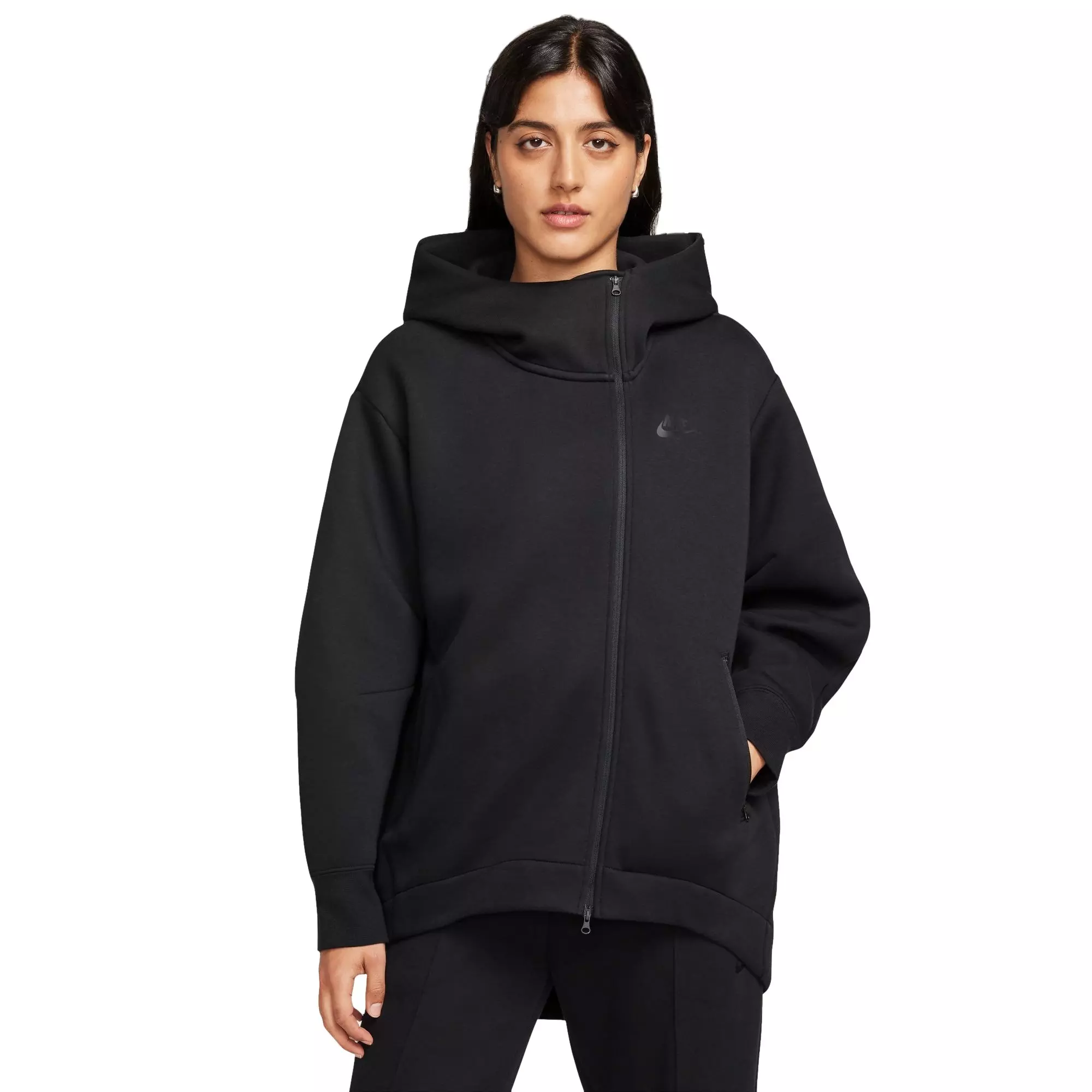Inspired by the color palette and textures found in natural minerals, tailored lines and sleek details elevate the hoodie for the 10 year anniversary of Nike Tech Fleece. Our premium, lightweight fleece–smooth both inside and out–gives you plenty of warmth without adding bulk. Updated darting and offset zippers help keep things fresh. Find the future of fleece, it starts here in the Nike Women's Sportswear Tech Fleece Cape Oversized Hoodie - Black.