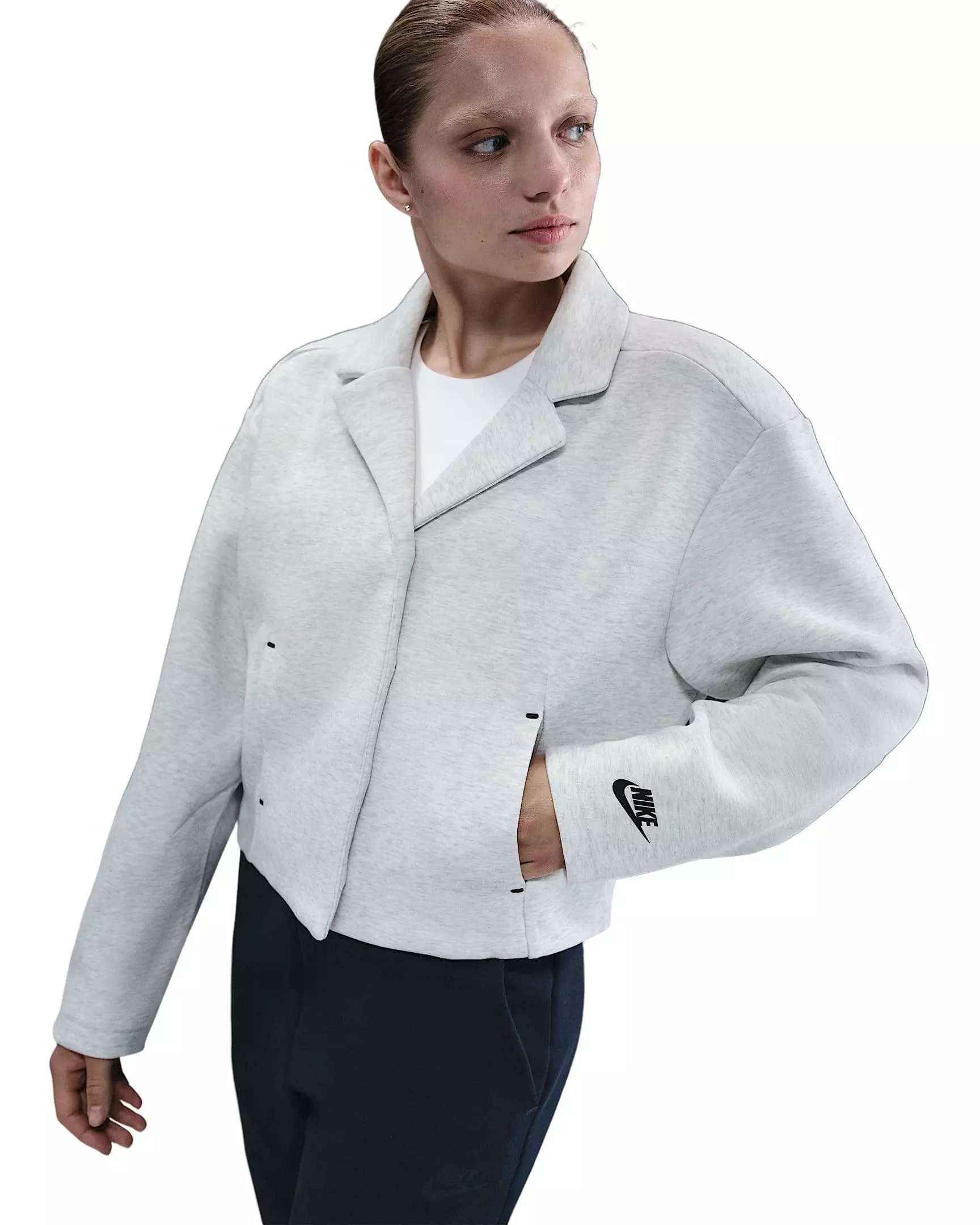 Streamlined and versatile, the Nike Women’s Sportswear Tech Fleece Tailored Jacket wraps you in lightweight warmth with a smooth feel inside and out. The light grey finish pairs easily with your everyday rotation while hidden snaps maintain a clean, minimalist look.