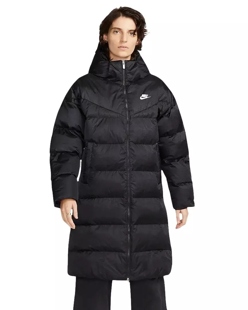 A COLD-WEATHER FAVORITE. The Nike Women's Sportswear Therma-FIT Synthetic Fill City Shine Parka updates a favorite Nike layer. Its Synthetic Fill weather-resistant fabric and insulation are both made with Recycled polyester fibers derived from plastic bottles. A scuba hood design and branded Swoosh tape make it a go-to cold-weather staple. This product is made with at least 50% Recycled polyester fibers. Stay Warm Comfort Nike Therma-FIT technology helps manage your body's natural heat to help keep you warm in cold-weather conditions. Recycled Shell and Insulation The insulation and Nike Repel weather-resistant fabric are made with 100% Recycled polyester. Both materials come from plastic bottles that Nike has diverted from landfills since 2010--bringing Nike's total to More than 7 billion. Everyday Comfort Fleece cuffs provide a cozy comfortable feel. Zippered front pockets provide secure storage for your phone keys and cold hands. More Benefits The printed graphic on The chest provides a heritage Nike look. An elasticated Swoosh band at The bottom hem elevates The look and provides a comfortable snug feel.Features