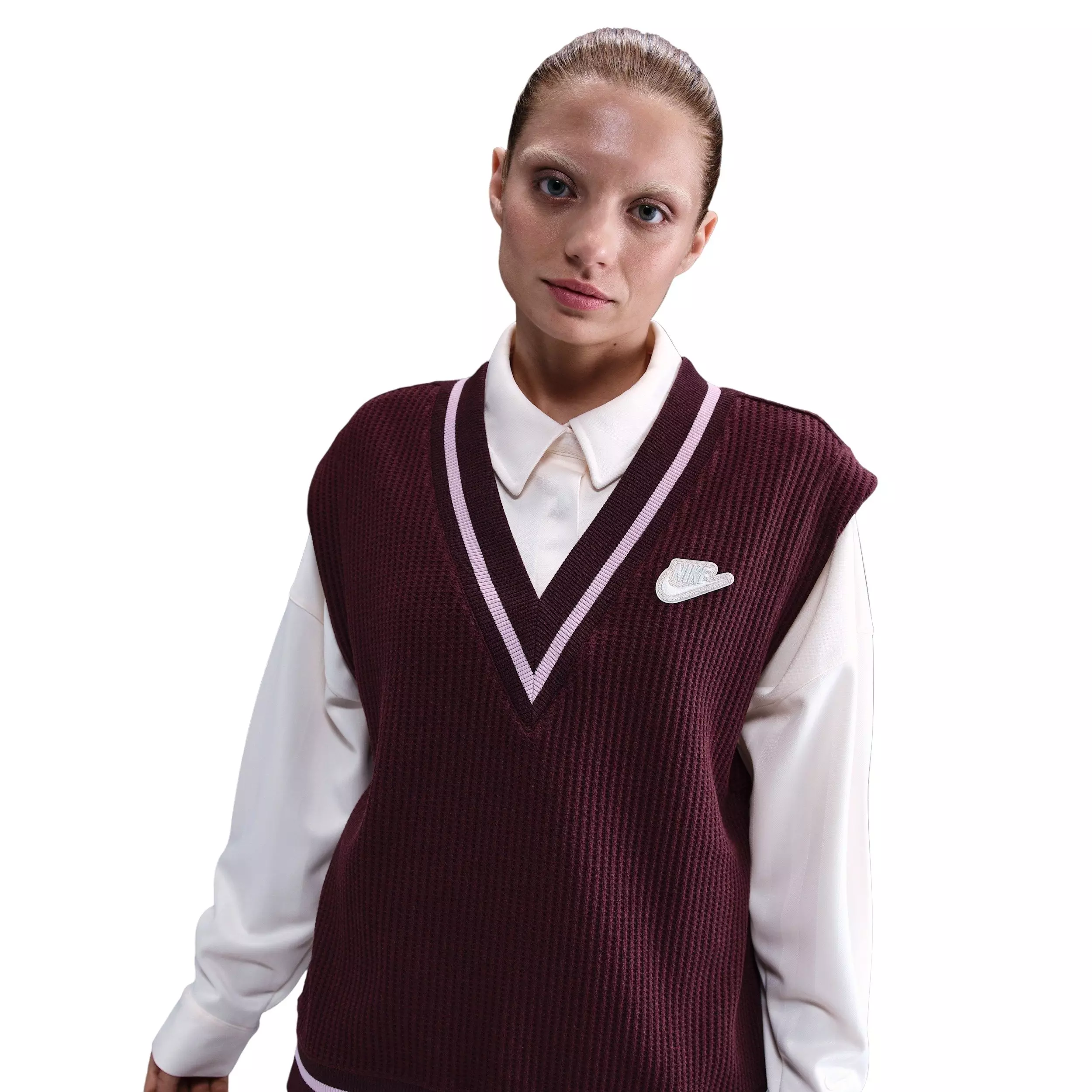 Stripped ribbing references heritage sport while waffle-knit fabric adds texture to this loose burgundy Nike Women's Sportswear Waffle-Knit Vest.Features
