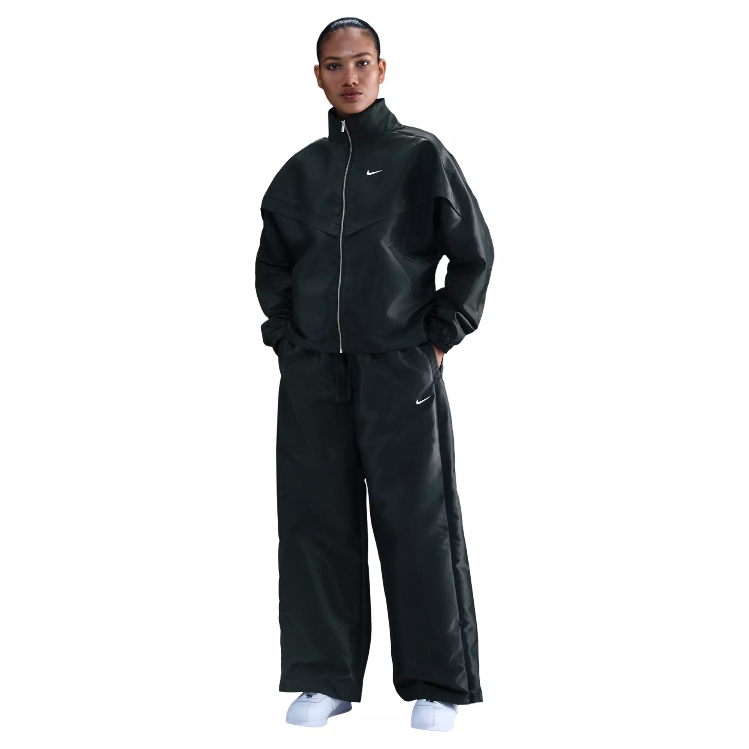 Mid-rise and oversized, these Nike Women's Sportswear Windrunner Shine Pants - Green are made from nylon for that extra shine and texture. Invisible zippers at the hem let you switch up the silhouette.Features