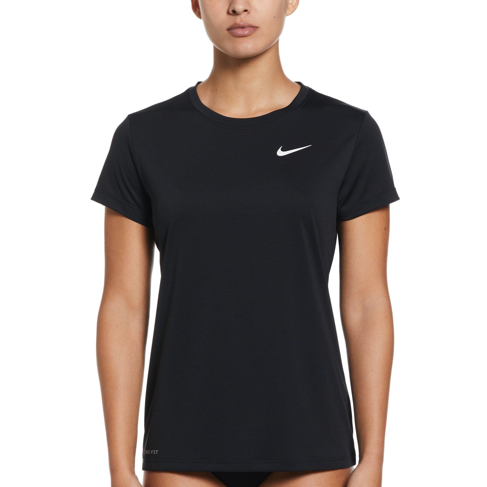 Stay protected in the pool or at the beach in this Nike Women's Swim Essential Dri-FIT Hydroguard Short Sleeve Shirt. Made with Dri-FIT technology that wicks moisture away from your body, this loose fitting rash guard keeps you dry and comfortable before and after swimming. An internal neck tape prevents chafing when you’re in the water and UPF 40+ sun protection helps block the sun’s harmful rays on covered areas. This water shirt with its subtle Nike Swoosh, is made from at least 75% recycled materials, so you can feel good about your choice.Features