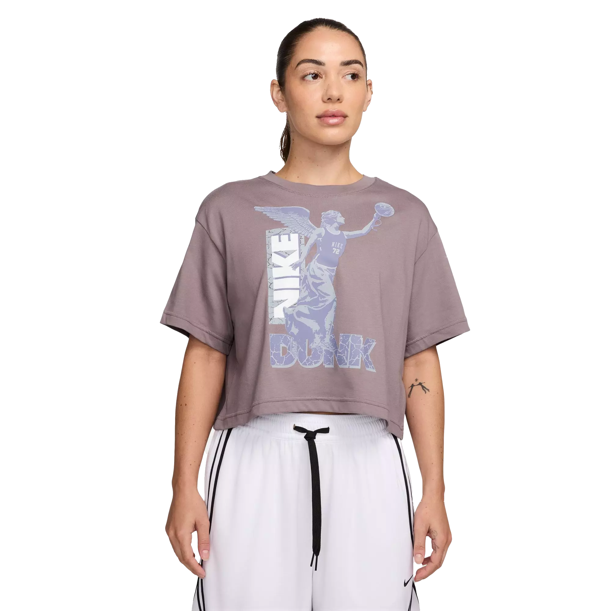The Nike Women's Swoosh Fly Tee features soft, midweight cotton that drapes gently across the shoulders and rests close to the body. Its loose fit offers a roomy, comfortable silhouette suited to any activity.