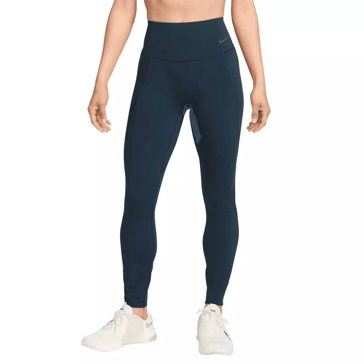 Don't let 'em see you sweat. We elevated our blue Nike Women's Universa Med-Support High-Waisted Full-Length Leggings w/ Pockets with moisture-concealing technology. Their midweight, ultra-smooth fabric offers squat-proof stretch that lifts and shapes. Plus, an updated waistband resists rolling, so you can go all out with confidence.Features