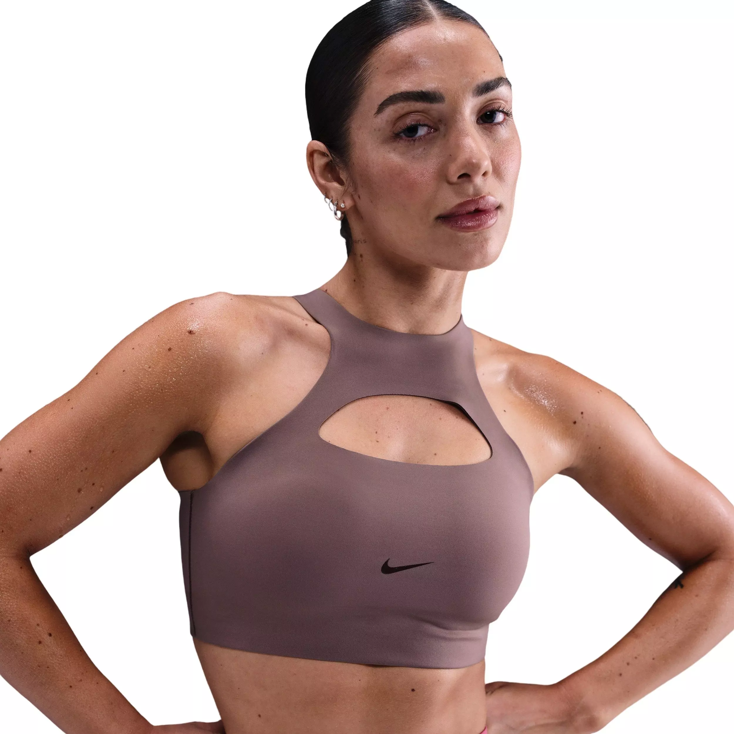 Don't let em see you sweat. Our tattoo purple Nike Women's Universa Medium-Support Padded Sports Bra is made with Nike Stealth Evaporation Tech that conceals moisture. Midweight and ultrasmooth, this sleek bra gives you a snug hold and offers a smooth fit with sculpted pads and low-profile design lines.Features