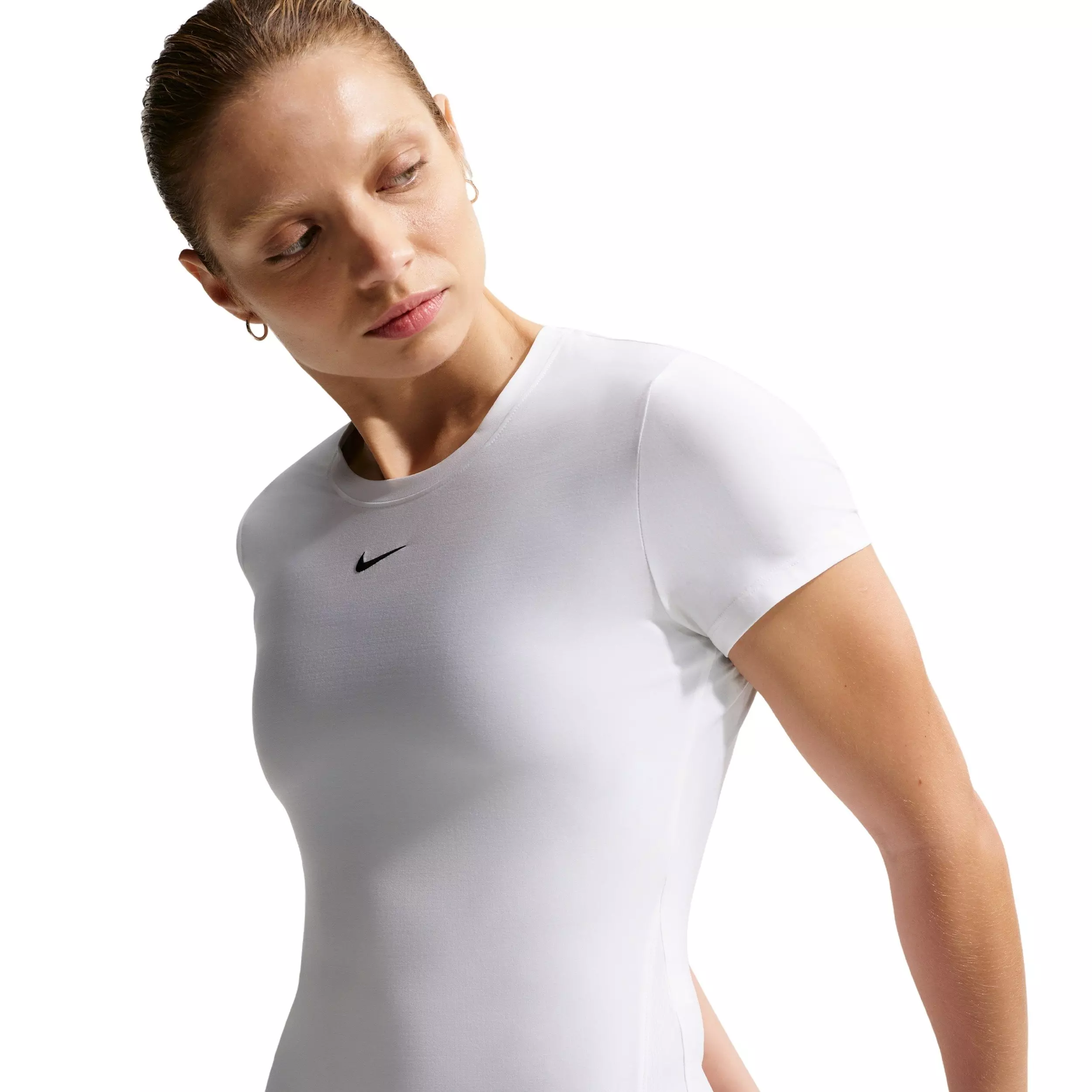 Court and course ready, this sweat-wicking white Nike Women's Victory Dri-FIT Short-Sleeve Tennis Top helps keep you dry and comfortable throughout your day.