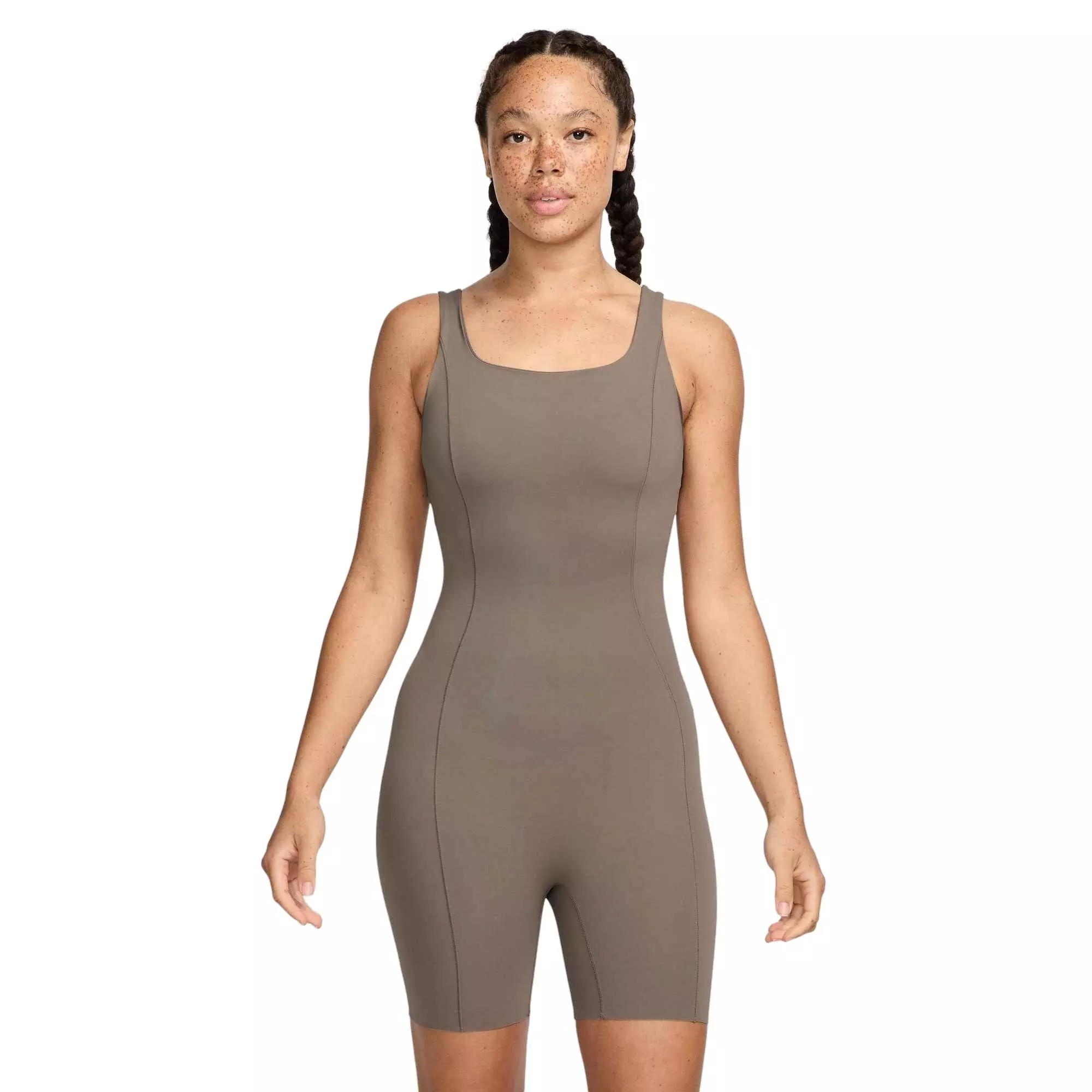 Move freely in the Nike Women’s Zenvy Dri-FIT Short Bodysuit – Brown. A gentle, body-hugging feel supports every pose while sweat-wicking Dri-FIT technology and an open-back design help keep you cool and dry. Lightweight InfinaSoft fabric delivers softness you can feel with every bend, stretch, and shift.