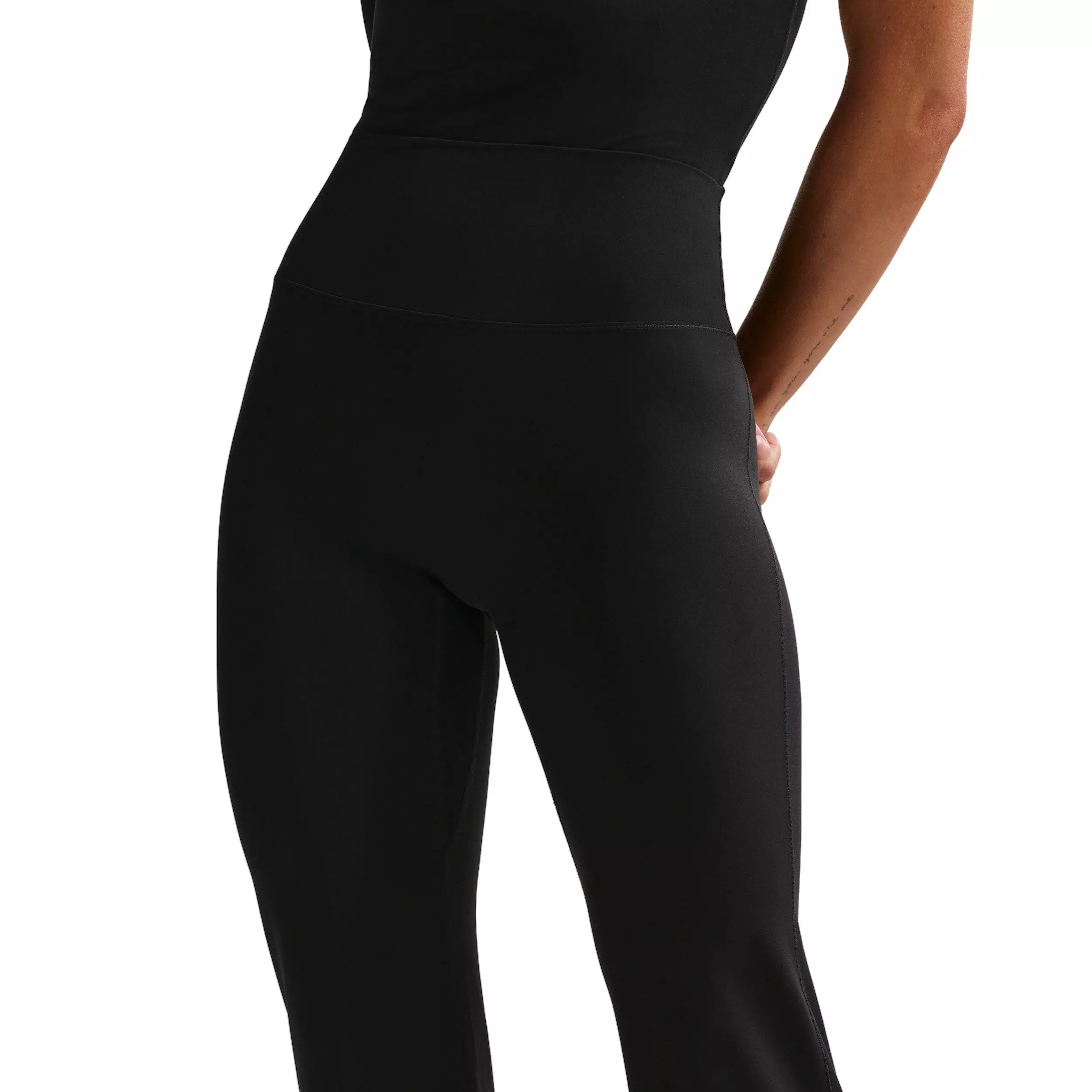 Bend and stretch in total confidence. Still lightweight, our updated InfinaSoft fabric is now ultrasoft with stretch designed to recover its shape wear after wear in these black Nike Women's Zenvy High-Waisted Flared Leggings with No Front Seam..Features