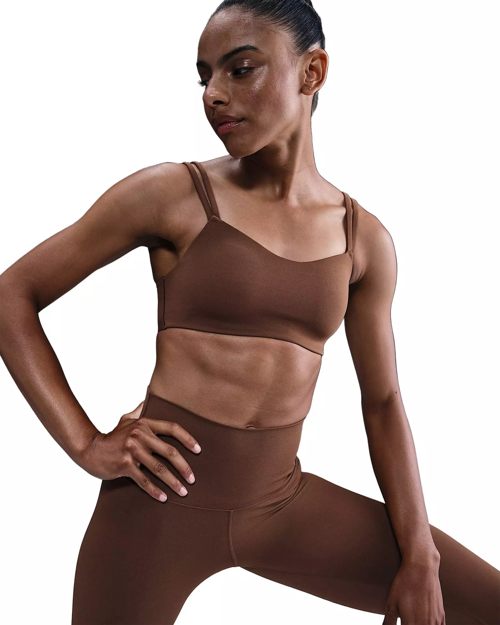 Feel calm and confident all day long in this brown, gently supportive Nike Women's Zenvy Strappy Light-Support Padded Sports Bra. A sewn-in 1-piece pad offers enhanced coverage and shaping while sweat-wicking technology helps keep you cool and comfortable. The fabric in the body and straps is lightweight, with softness that you can feel with every bend, stretch and shift. With a rounded V-neck to top it off, the bra has a clean finish that goes with any outfit.Features