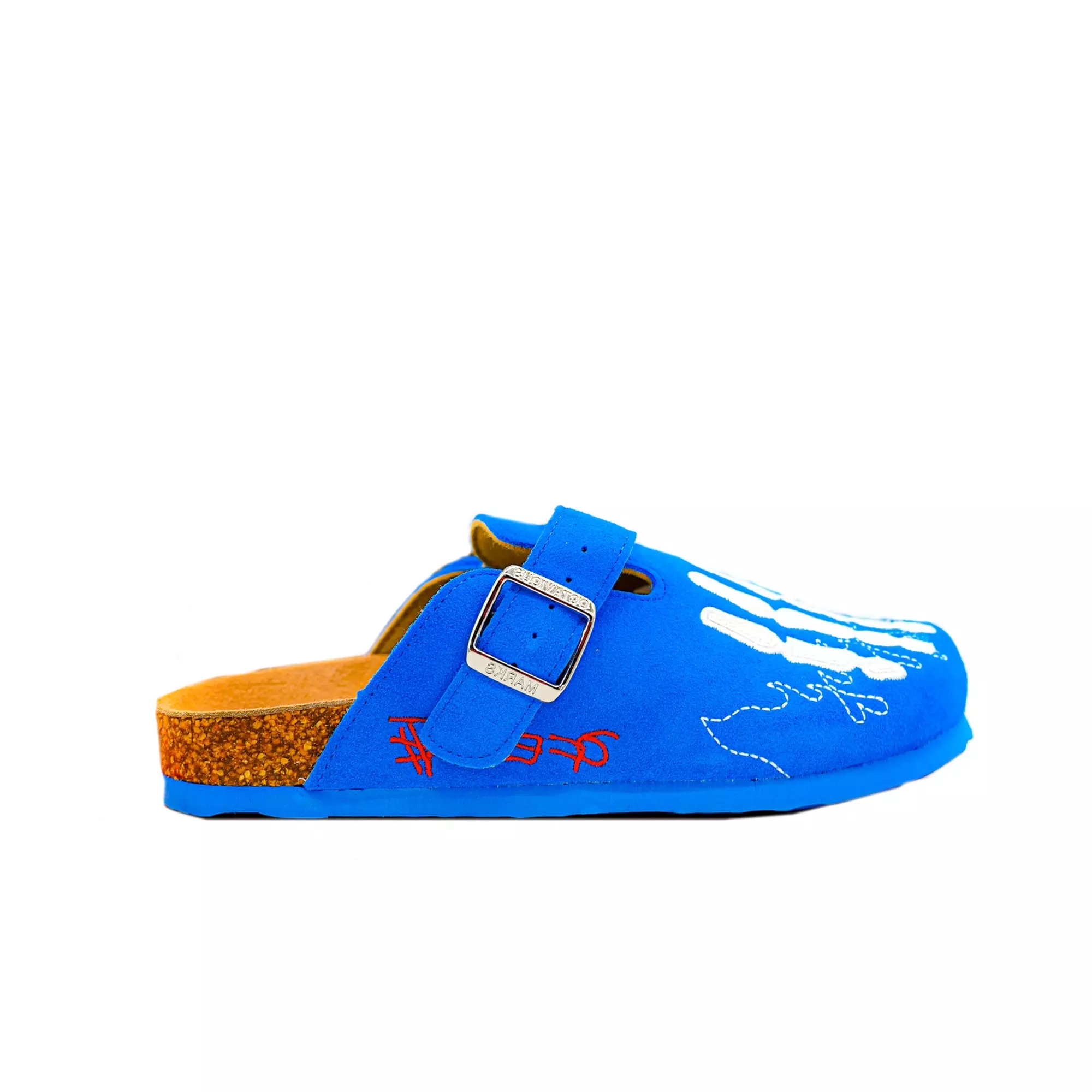 This clog showcases a light blue suede upper, precise embroidered foot bone detailing and blazing flame-stitched accents that ignite individuality at every step. Each pair celebrates bold artistry with every stride. Built to stand out at every turn.