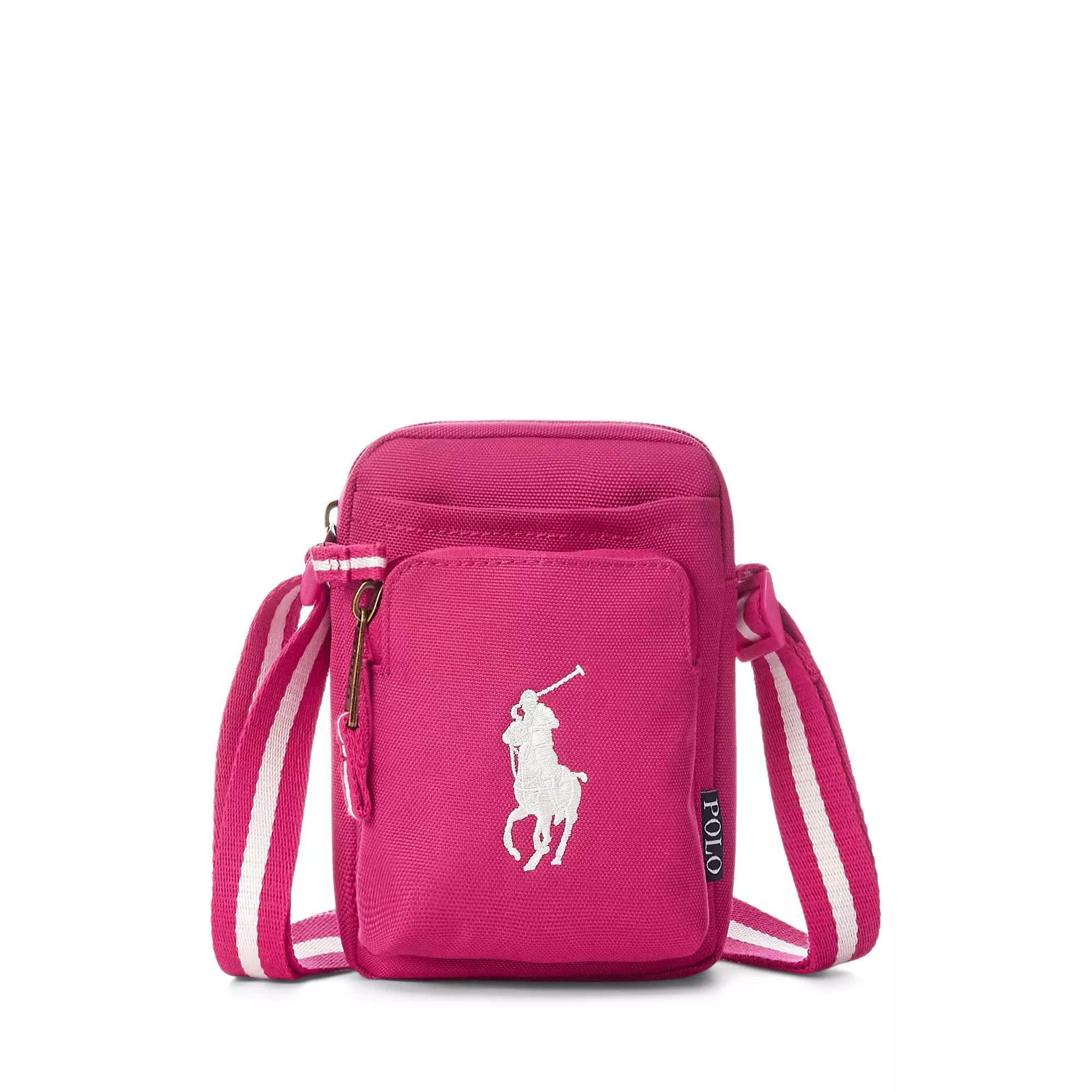 This pink Polo Ralph Lauren Color Festival Crossbody Bag features the iconic Big Pony embroidered on durable polyester fabric. Antique-style parts and the coloring of the shoulder strap add accents to the design. Its compact size allows for a smartphone and small accessories, making it ideal for when you're out and about with minimal luggage.Features