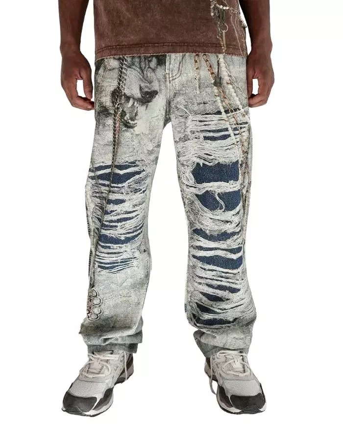 • Aesthetic: Distressed finish and chain rip detailing deliver a modern, edgy vibe.