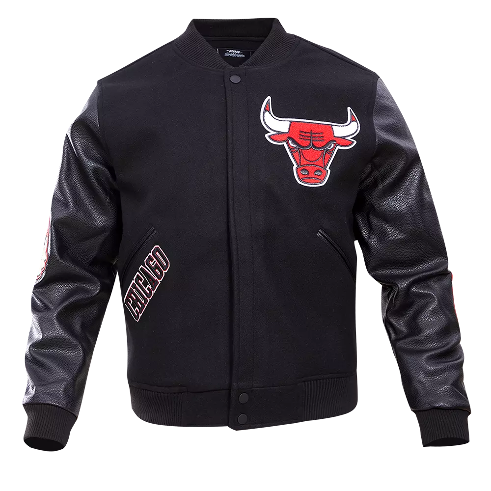 This black Pro Standard Men's​ Chicago Bulls Classic Wool Varsity Jacket will make you stand out from the crowd. The midweight jacket will keep you comfortable when the temperature drops thanks to the jacket’s stand -up collar quilted lining and full-zip front. Various pockets offer storage for all essentials. This stylish jacket features faux leather sleeves and base felt chenille team logo patches, and 3D embroidery, making it the perfect choice for any fashion-savvy individual.