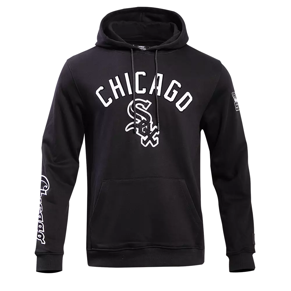 Pro Standard Men's Chicago White Sox Classic Fleece PO Hoodie -BlackThis black Pro Standard Men's Chicago White Sox Classic Fleece PO Hoodie features an adjustable drawstring hood, a kangaroo pouch pocket with a soft fleece fabrication. This hoodie is perfect for staying warm and making sure your fandom is noticeable, while the relax fit ensures all-day comfort. With striking graphics on the chest, sleeves and the back of the hoodie, you can bundle up in this comfortable cotton hoodie and rest easy in knowing your team is being well represented.