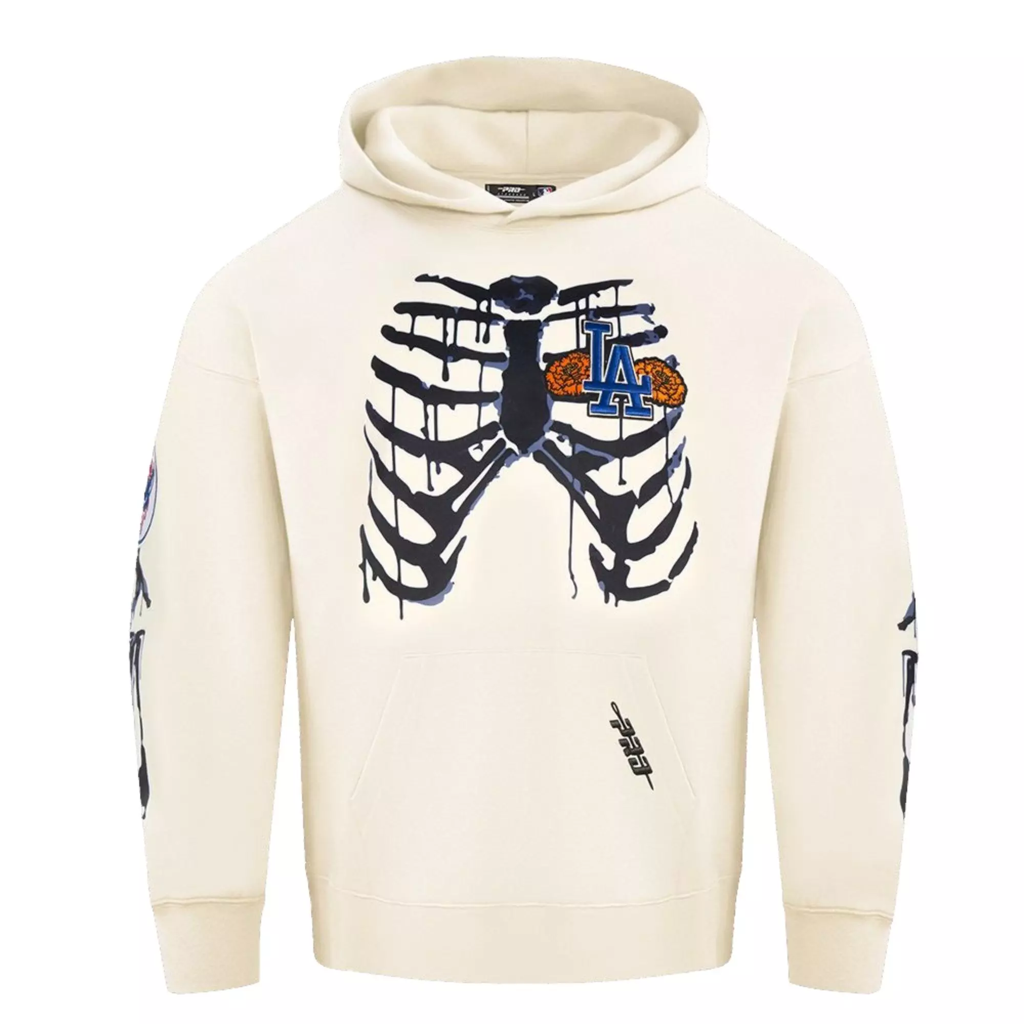 Celebrate the Los Angeles Dodgers and the spirit of Dia de los Muertos with this striking Pro Standard Men's Los Angeles Dodgers Rib Cage Hoodie-Cream. Featuring a bold skeletal ribcage design on the front and a beautifully detailed calavera (Mexican sugar skull) on the back, this hoodie combines baseball pride with cultural flair. The LA Dodgers logos, along with the vibrant marigold accents on the skull, give this hoodie a unique style perfect for any fan. The cream-colored base and detailed graphics make it a standout piece, perfect for game day or casual wear.Features