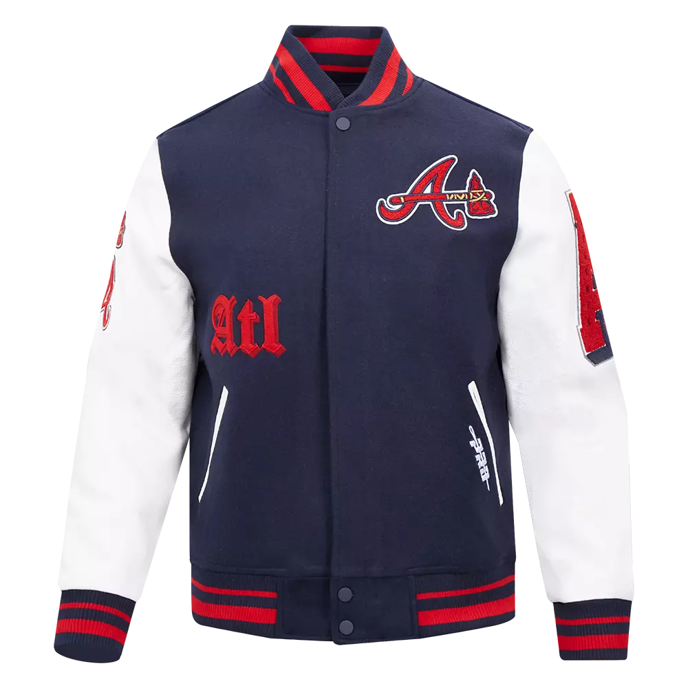 Athletic competition dates back. The Old English Capsule features the Renaissance-esque typeface alongside team emblems. Display your loyalty, feel like fan royalty, and conquer the day's look. This navy & red Pro Standard Men's MLB Atlanta Braves Old English Rib Wool Varsity Jacket will make you stand out from the crowd. The midweight jacket will keep you comfortable when the temperature drops thanks to the jacket’s stand -up collar quilted lining and full-zip front. Various pockets offer storage for all essentials. This stylish jacket features faux leather sleeves and elevated team logos.