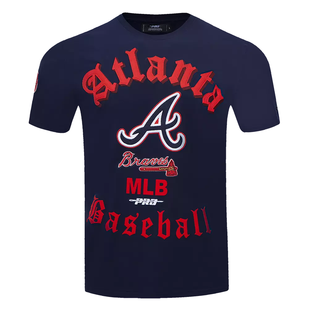 Athletic competition dates back. The Old English Capsule features the Renaissance-esque typeface alongside team emblems. Display your loyalty, feel like fan royalty, and conquer the day's look.This navy Pro Standard Men's MLB Atlanta Braves Old English Tee is made from single jersey cotton and features base twill 3D satin Stitch embroidery and premium team logo patches. The combination of these elements creates a unique and eye-catching shirt that is sure to turn heads. Whether you're dressing up for a night out or just looking for a cool new casual shirt, our tee is the perfect choice.