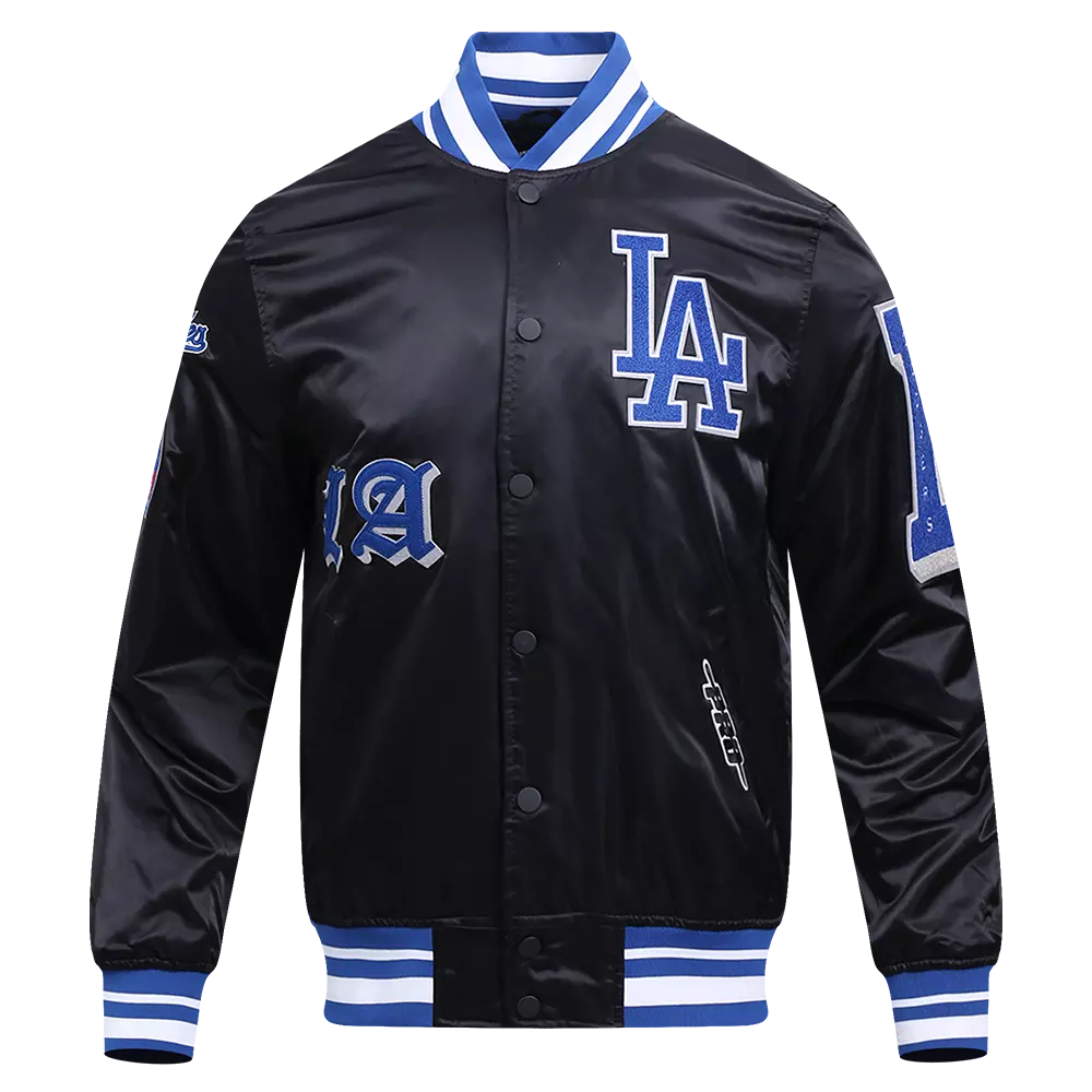 Athletic competition dates back. The Old English Capsule features the Renaissance-esque typeface alongside team emblems. Display your loyalty, feel like fan royalty, and conquer the day's look. This black & blue Pro Standard Men's MLB Los Angeles Dodgers Old English Rib Satin Varsity Jacket will keep you comfortable when the temperature drops. Featuring a quilted lining and button front closure. Various pockets offer storage for all your essentials. This stylish jacket features faux leather sleeves and base felt chenille team logo patches, and 3D embroidery, making it the perfect choice for any fashion-savvy individual.Features