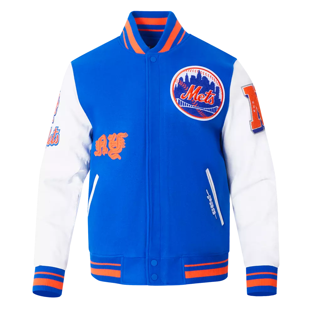 Athletic competition dates back. The Old English Capsule features the Renaissance-esque typeface alongside team emblems. Display your loyalty, feel like fan royalty, and conquer the day's look. This royal & orange Pro Standard Men's MLB New York Mets Old English Rib Wool Varsity Jacket will make you stand out from the crowd. The midweight jacket will keep you comfortable when the temperature drops thanks to the jacket’s stand -up collar quilted lining and full-zip front. Various pockets offer storage for all essentials. This stylish jacket features faux leather sleeves and elevated team logos.