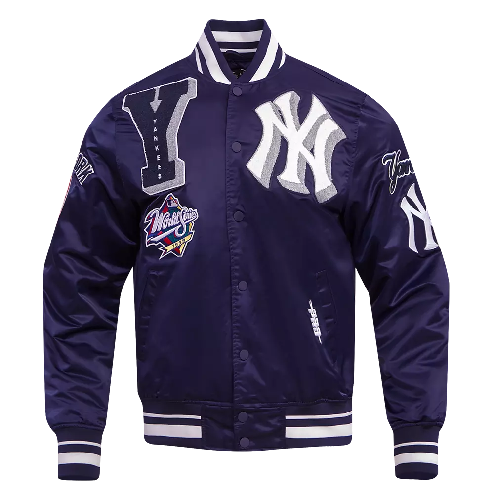 Better together. If you can’t decide which team logo is the vibe of the day, then don’t. The Mashup Capsule does the forbidden by combining team artwork from different eras into one piece. Remix it, and press play. This navy Pro Standard Men's MLB New York Yankees Mashup Rib Satin Jacket will keep you comfortable when the temperature drops. Featuring a quilted lining and button front closure. Various pockets offer storage for all your essentials. This stylish jacket features faux leather sleeves and base felt chenille team logo patches, and 3D embroidery, making it the perfect choice for any fashion-savvy individual.Features
