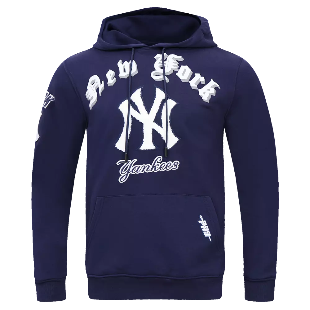 Athletic competition dates back. The Old English Capsule features the Renaissance-esque typeface alongside team emblems. Display your loyalty, feel like fan royalty, and conquer the day's look. This navy Pro Standard Men's MLB New York Yankees Old English PO Hoodie is our most comfortable cotton double knit hoodie that features elevated team logo patches. Pure sophistication!Features
