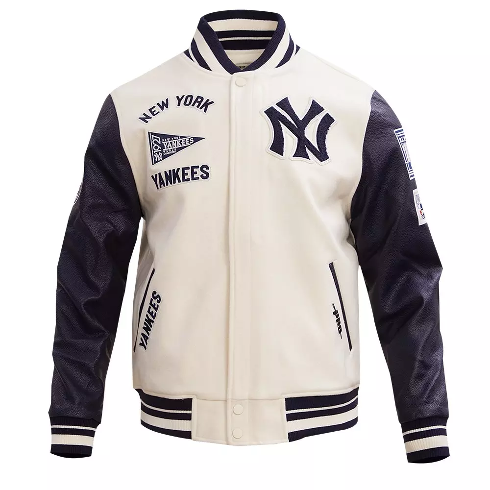 Introducing this eggshell & navy Pro Standard​ Men's​ MLB New York Yankees Retro Classic Rib Wool Varsity Jacket. This eggshell and navy jacket features ribbed waistband and cuffs for a better fit and snap button closure. With two front pockets, it has a modern, yet timeless look perfect for any fan of the New York Yankees. Enjoy the comfort and style of this jacket, designed with the durability and sustainability of Pro Standard.