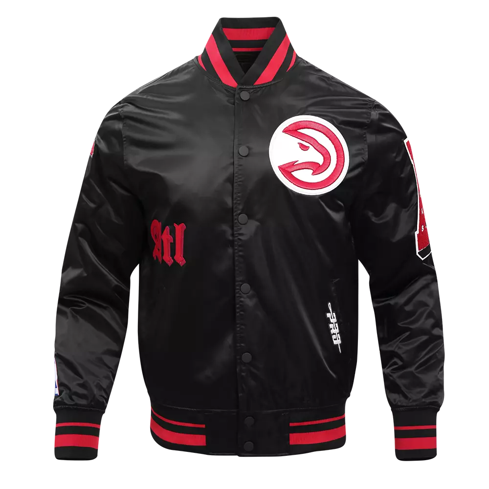 Athletic competition dates back. The Old English Capsule features the Renaissance-esque typeface alongside team emblems. Display your loyalty, feel like fan royalty, and conquer the day's look. This black & red Pro Standard Men's NBA Atlanta Hawks Old English Rib Satin Varsity Jacket will keep you comfortable when the temperature drops. Featuring a quilted lining and button front closure. Various pockets offer storage for all your essentials. This stylish jacket features faux leather sleeves and base felt chenille team logo patches, and 3D embroidery, making it the perfect choice for any fashion-savvy individual.Features
