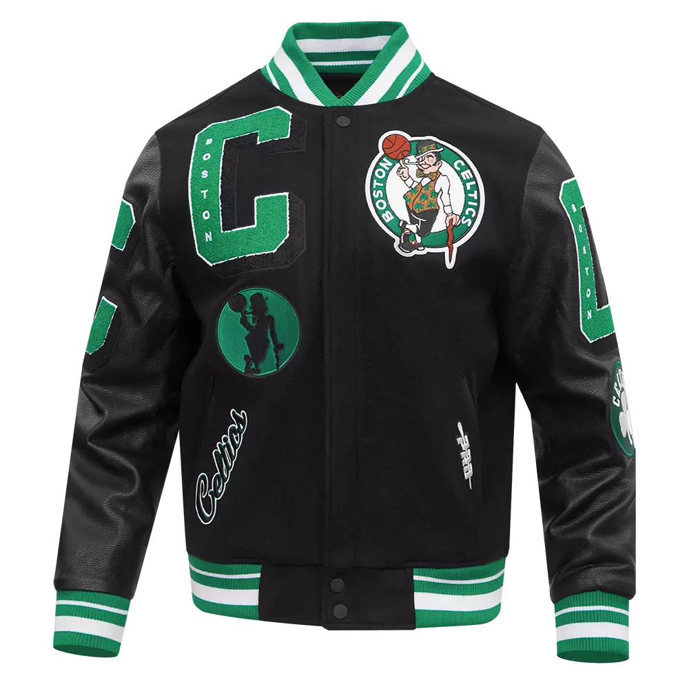 Celebrate every era of Celtics pride with the Pro Standard Men's NBA Boston Celtics Mashup Rib Wool Varsity Jacket -Black/Green. Its bold mashup artwork brings vintage and modern team details together for standout style on game day and beyond.