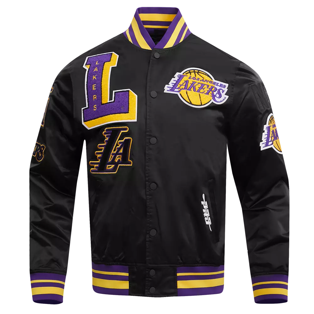 Better together. If you can’t decide which team logo is the vibe of the day, then don’t. The Mashup Capsule does the forbidden by combining team artwork from different eras into one piece. Remix it, and press play. This black & purple Pro Standard Men's NBA Los Angeles Lakers Mashup Rib Satin Jacket will keep you comfortable when the temperature drops. Featuring a quilted lining and button front closure. Various pockets offer storage for all your essentials. This stylish jacket features faux leather sleeves and base felt chenille team logo patches, and 3D embroidery, making it the perfect choice for any fashion-savvy individual.Features